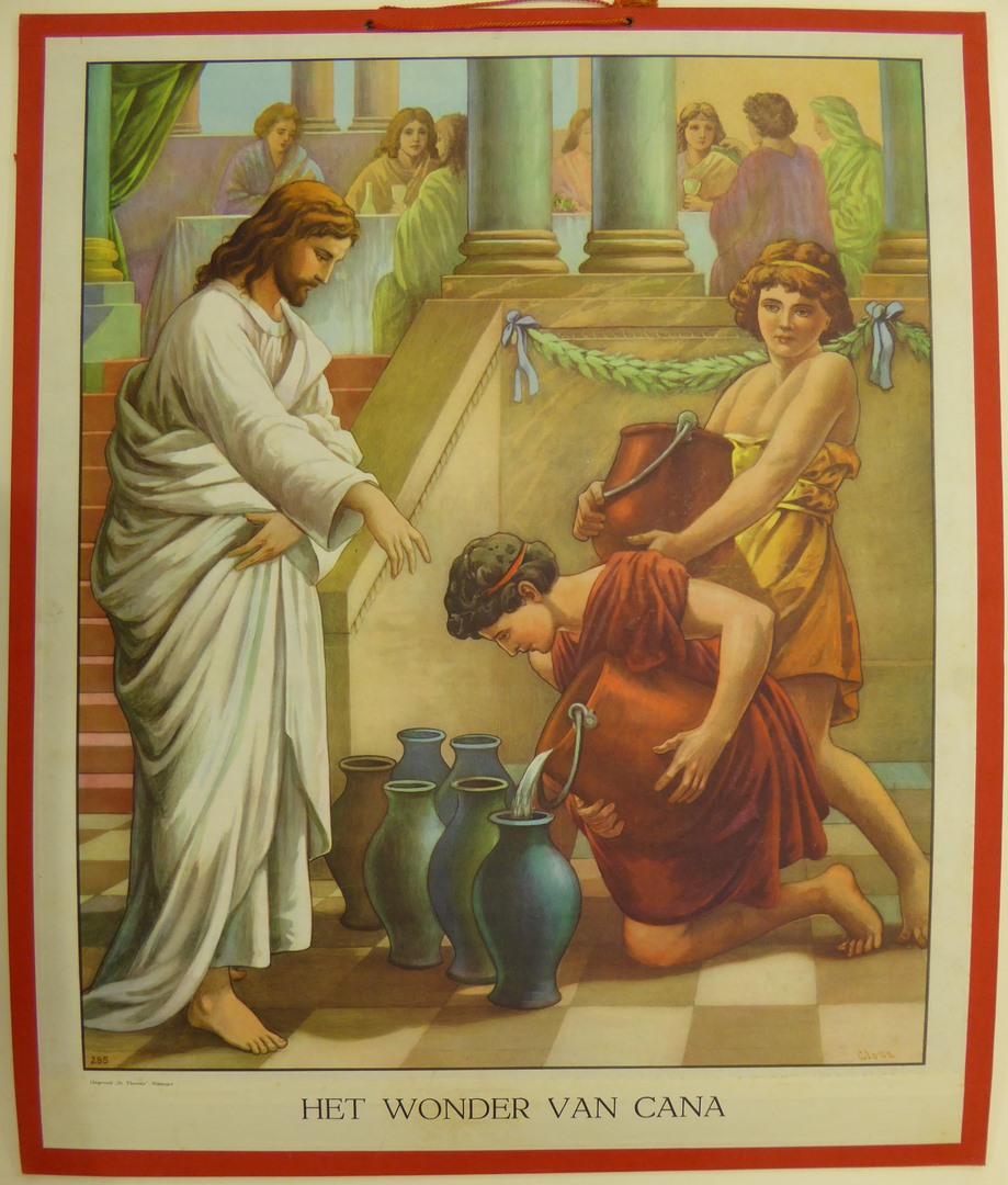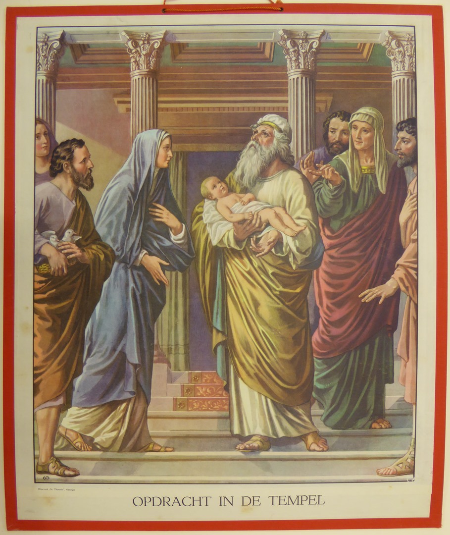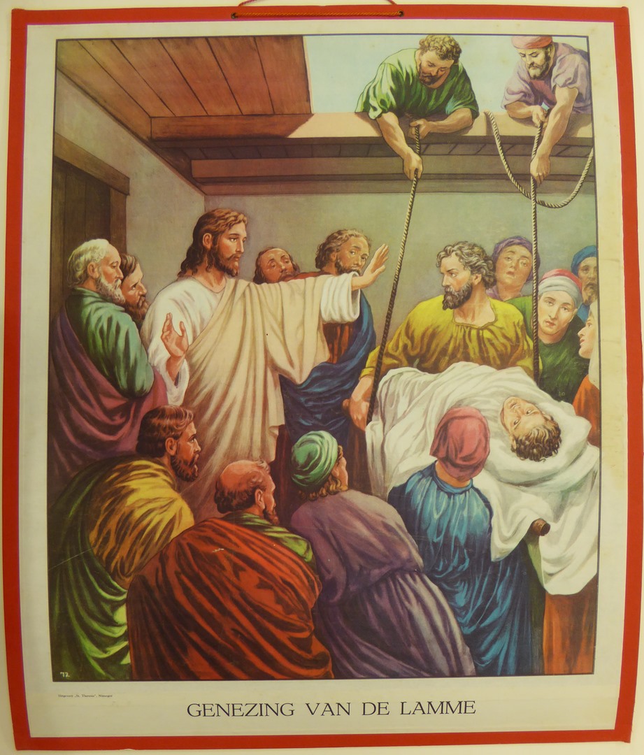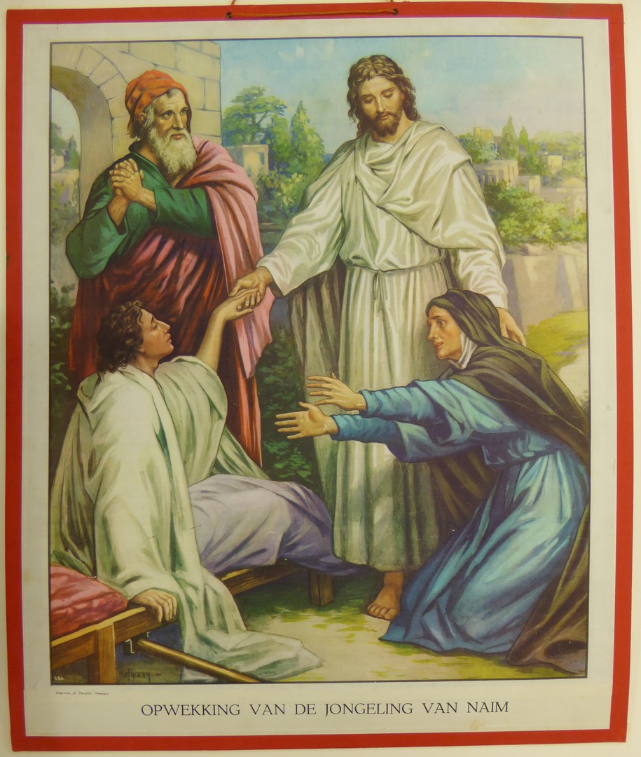 Jezus helpt Maria en Jozef, Maria spint, Jozef zaagt