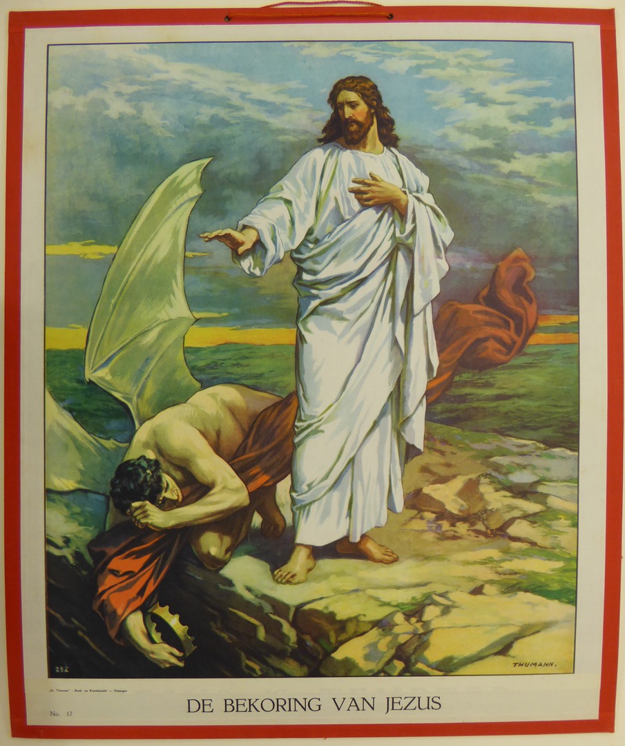De bekoring van Jezus, met duivelfiguur met kroon in...