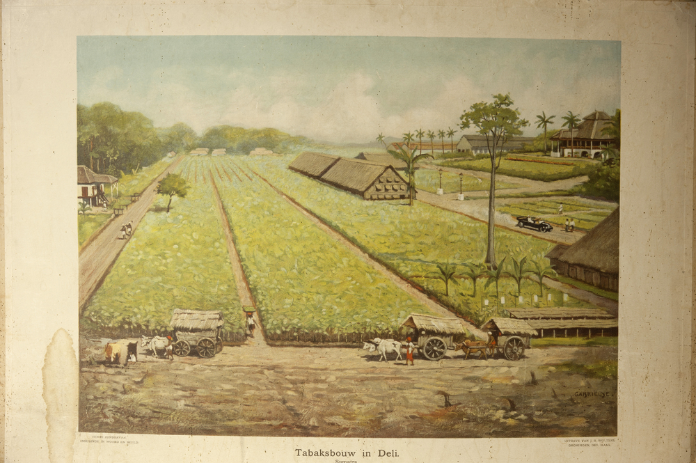 Schoolplaat getiteld 'Tabaksbouw in Deli. Sumatra.'