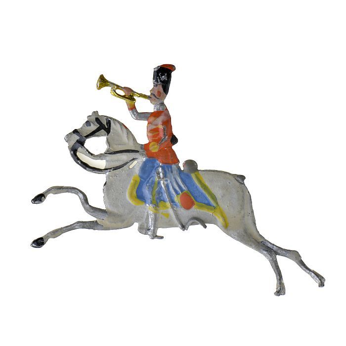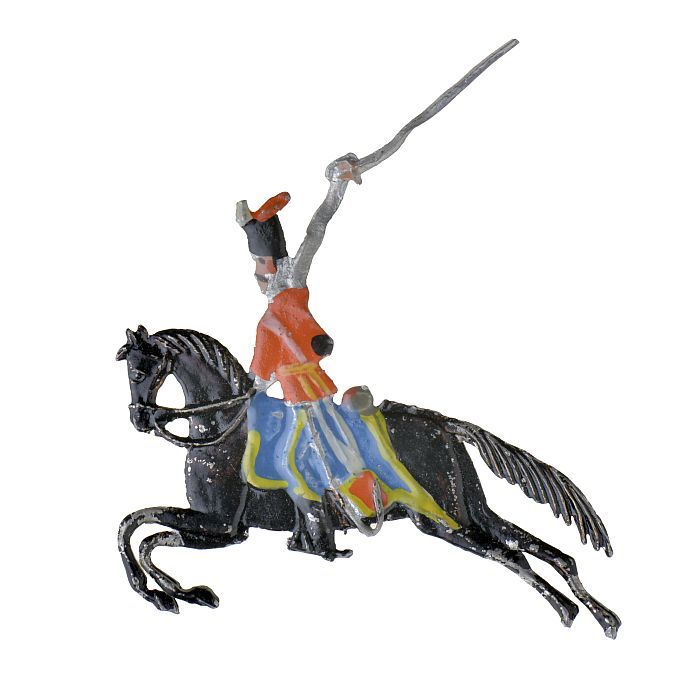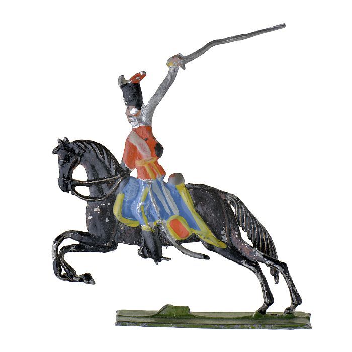 Tinnen figuren in de vorm van Engelse huzaren te paard