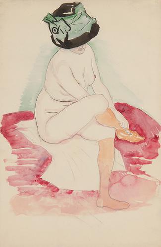 Zittend naaktmodel met rode kousen en hoed