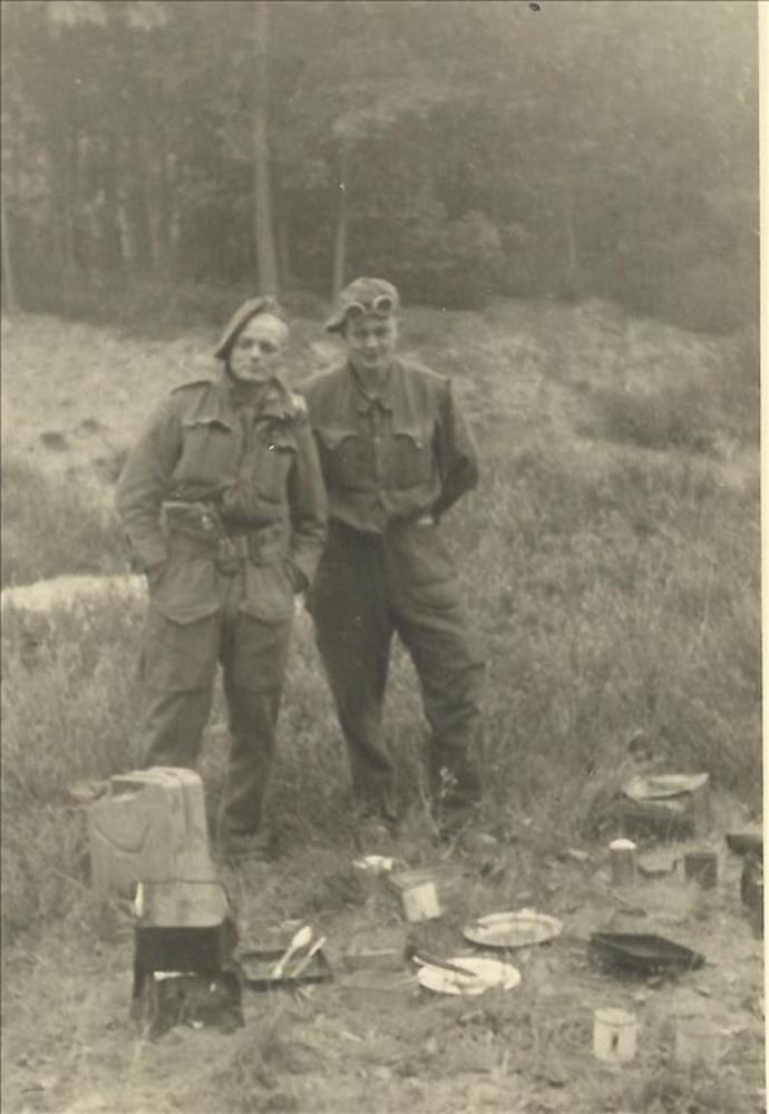 twee Britse militaire bij kampeerplaats in bos