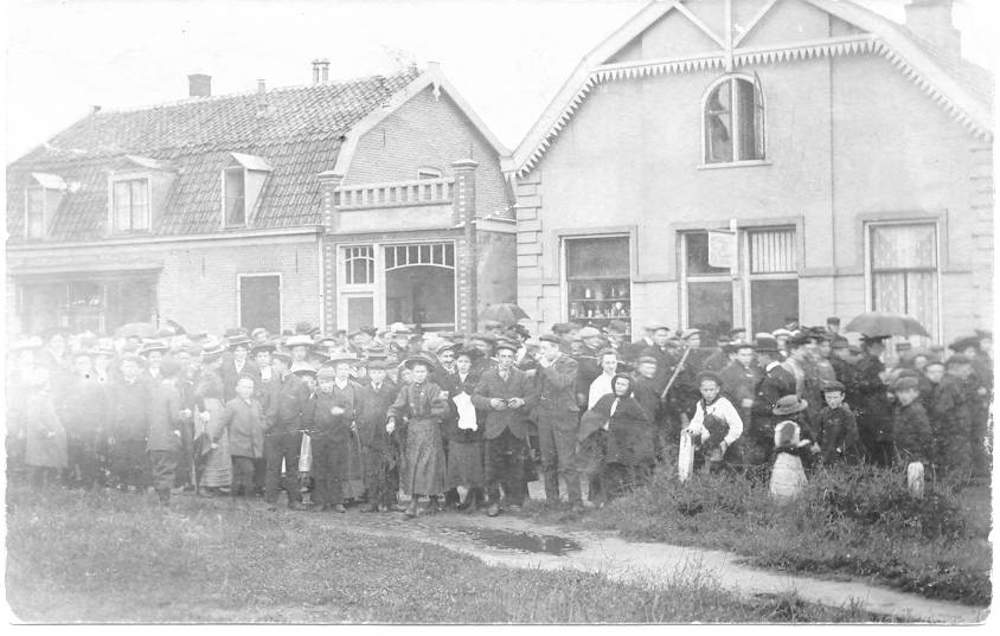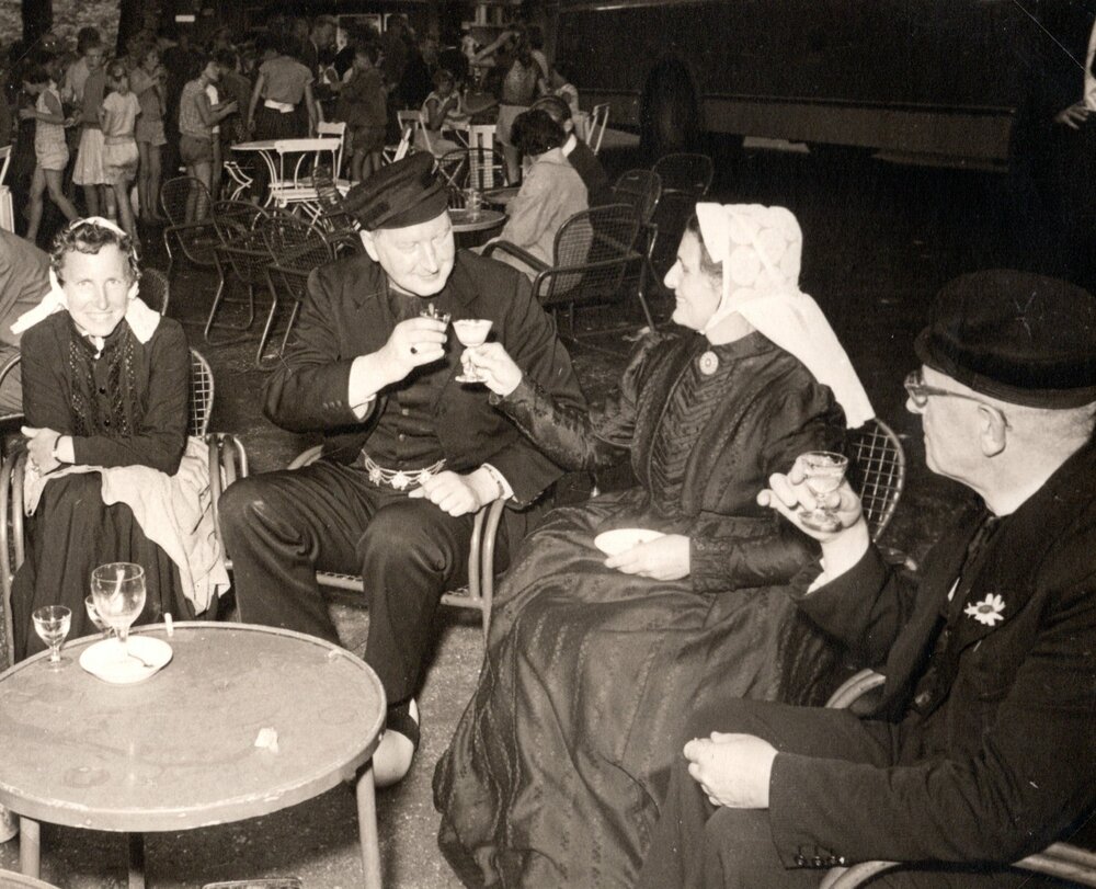 Dames en heren in oud – Veluwse kledij drinken een b...