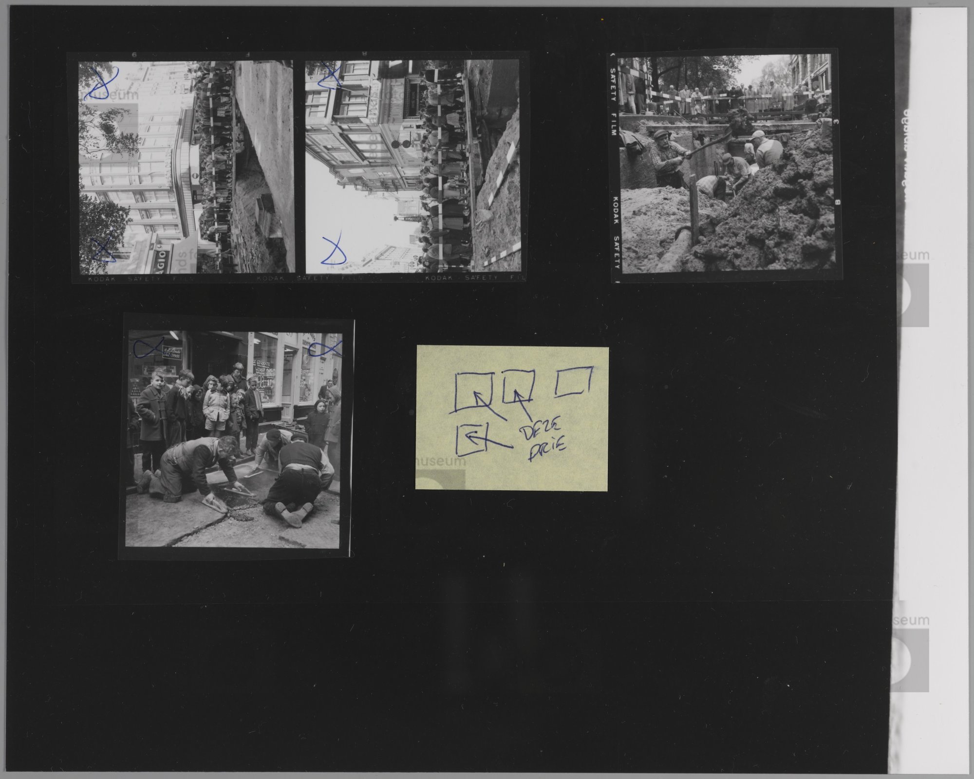 Amsterdam. Spui, hoek Kalverstraat. Wegwerkzaamheden.