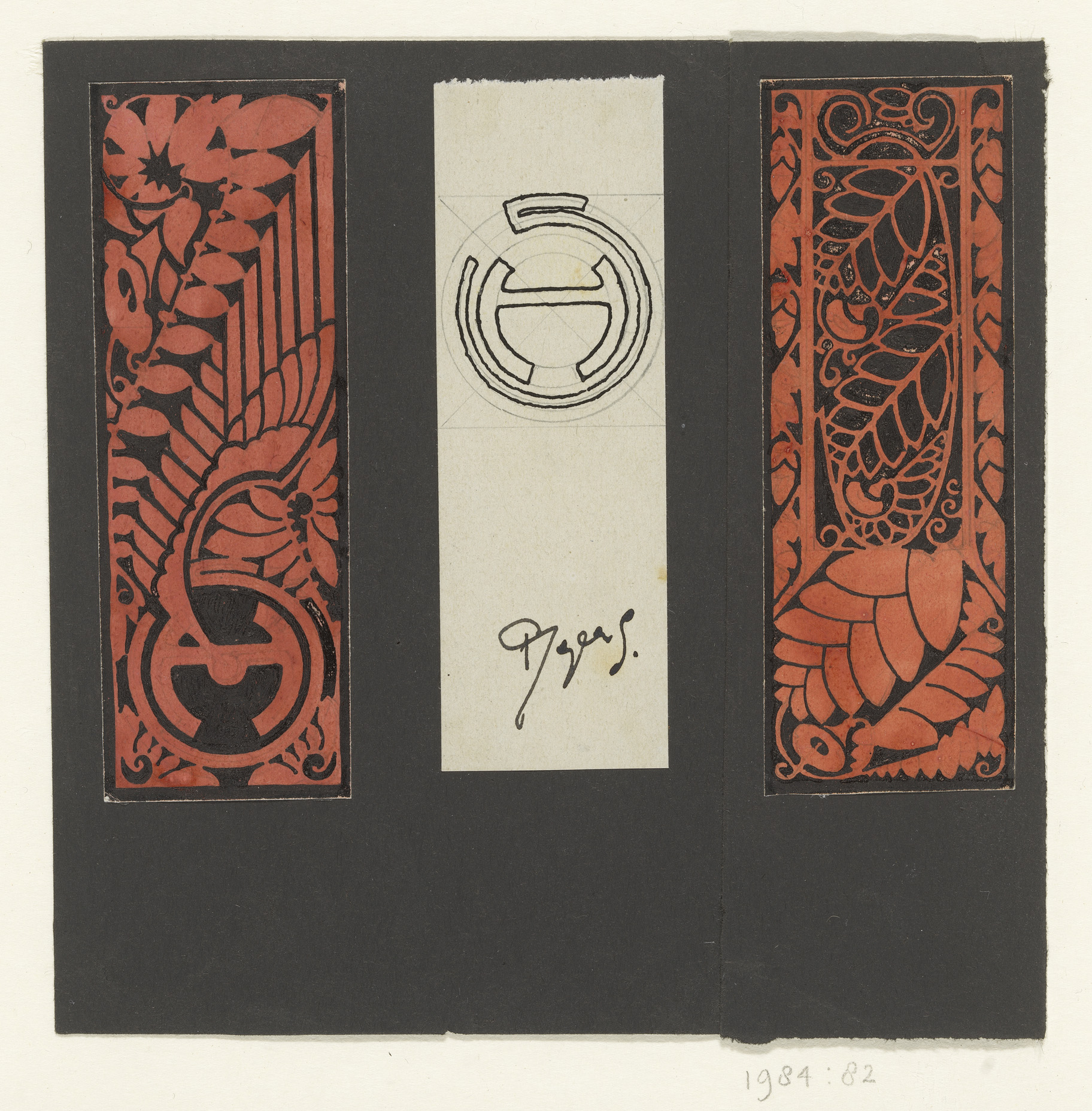 Drie panelen met bladmotieven en symbolen