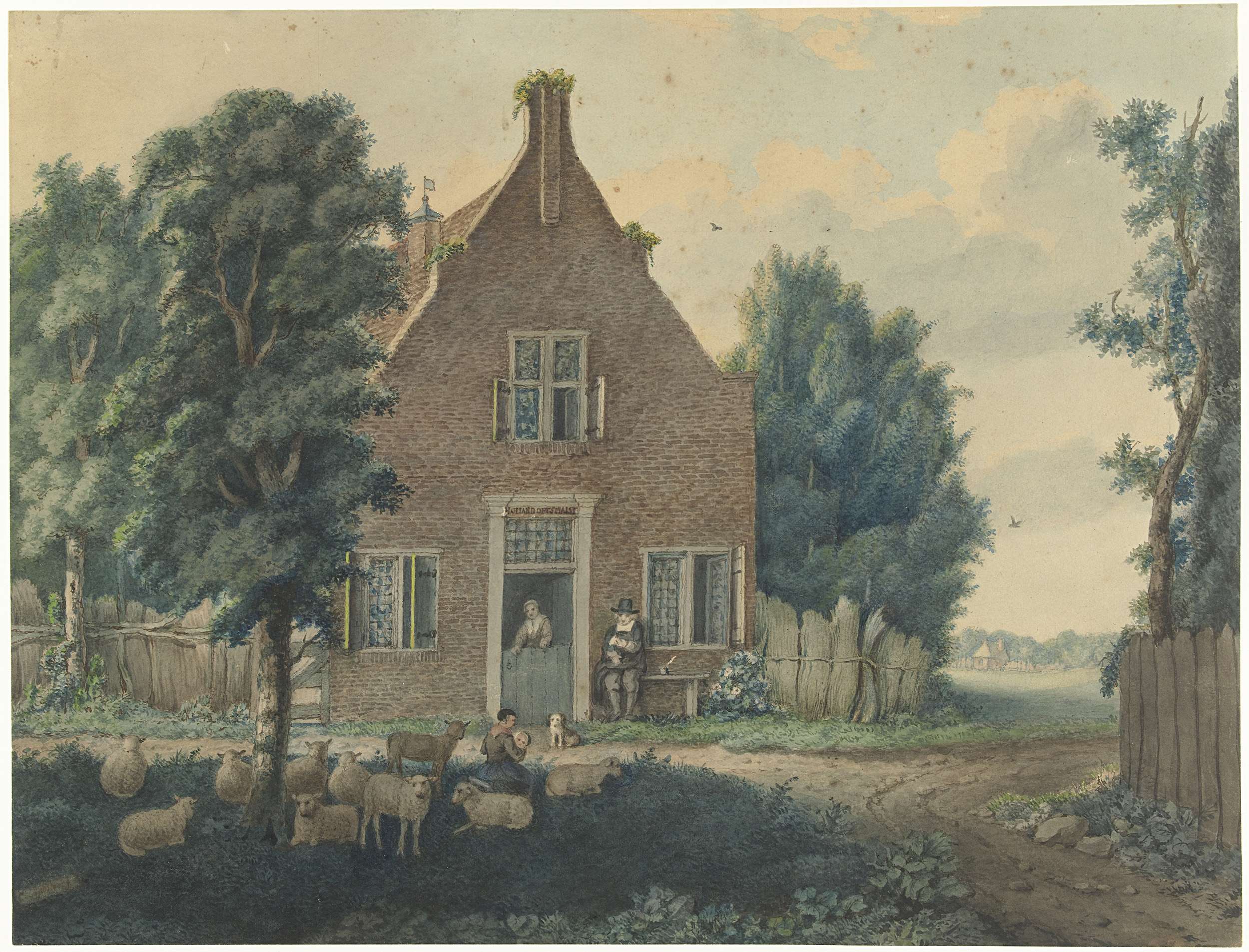 Landschap met een huis tussen bomen en een weg langs...