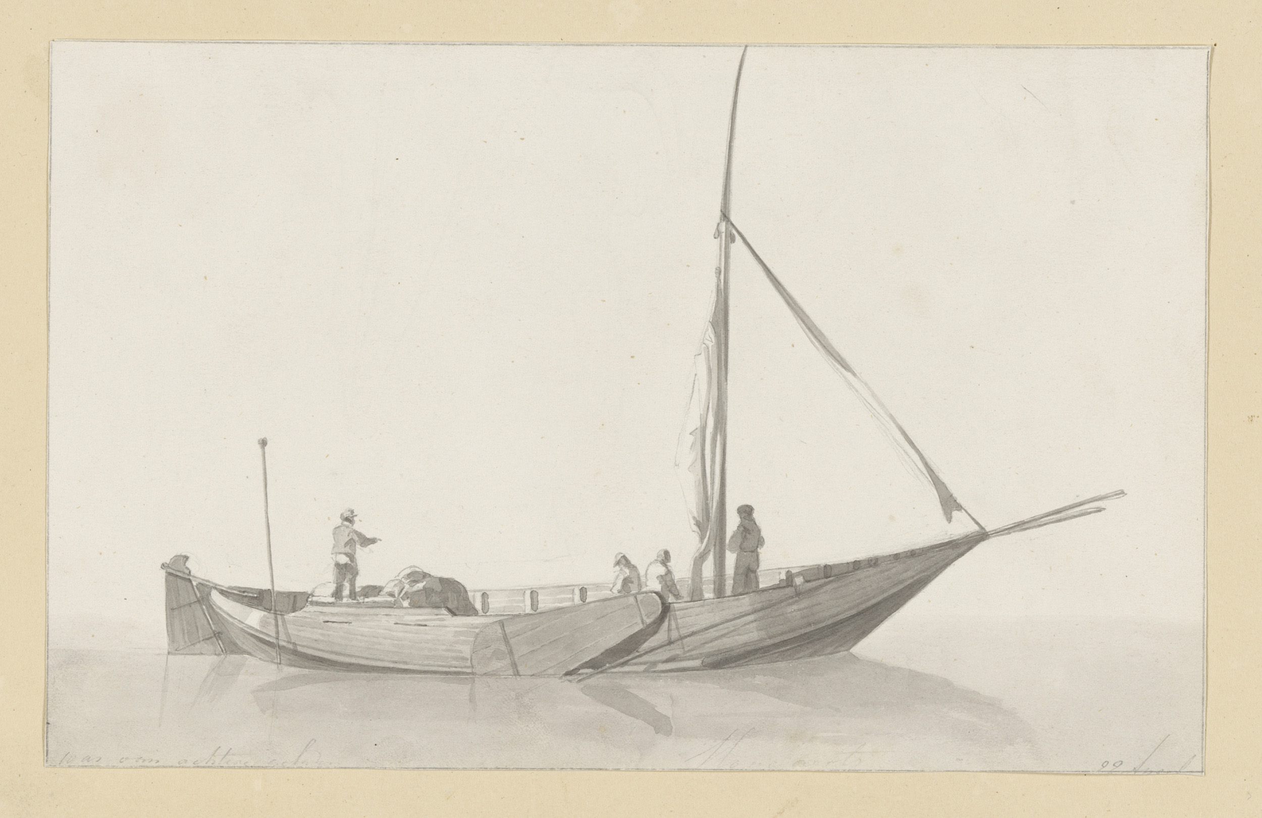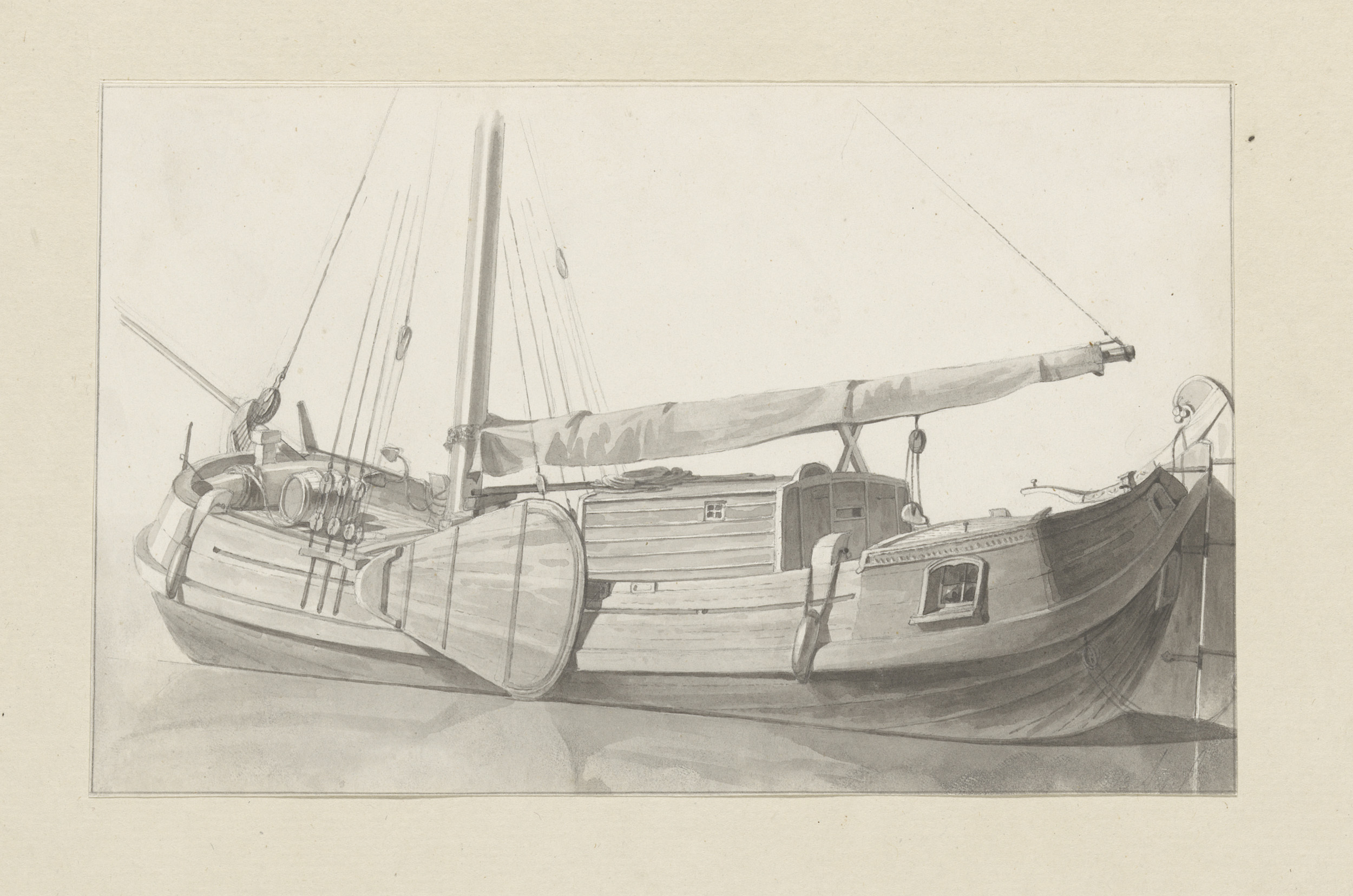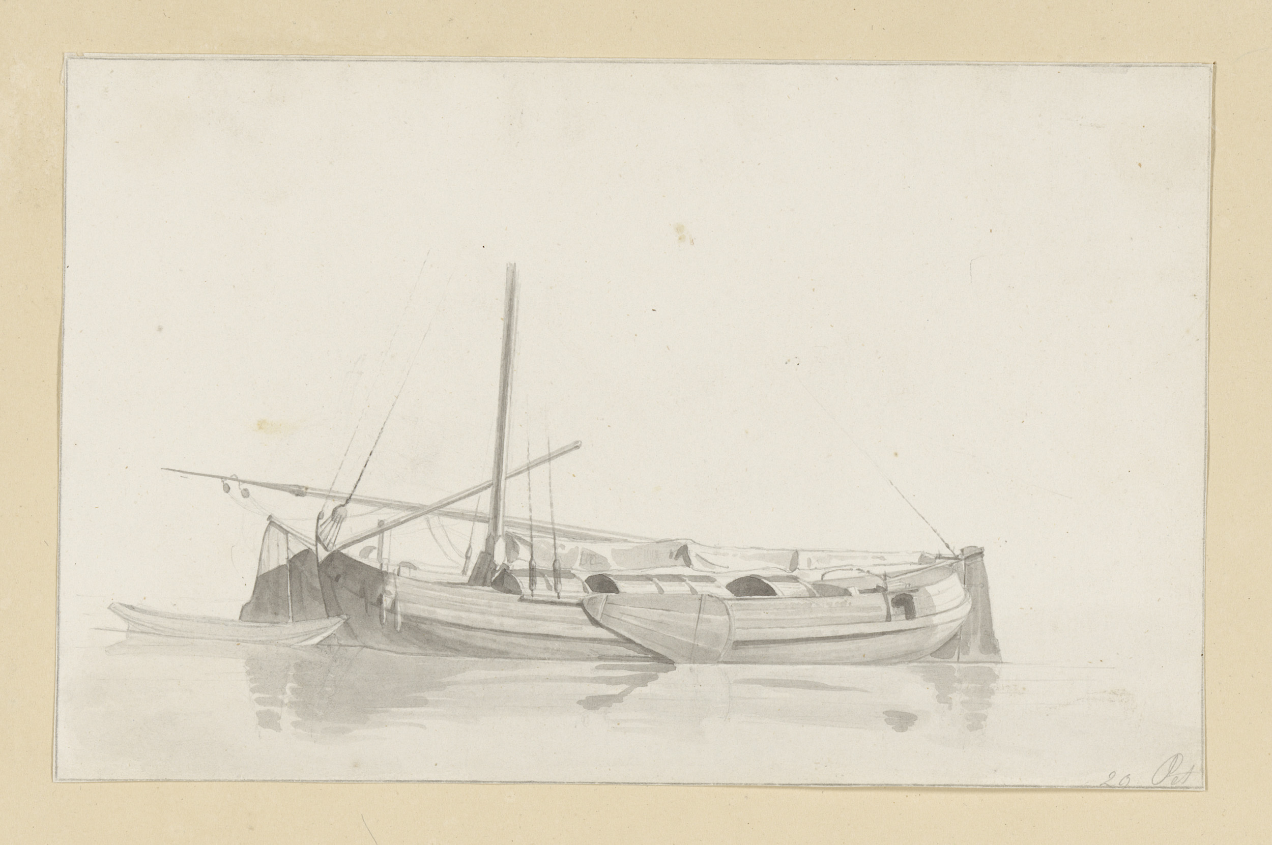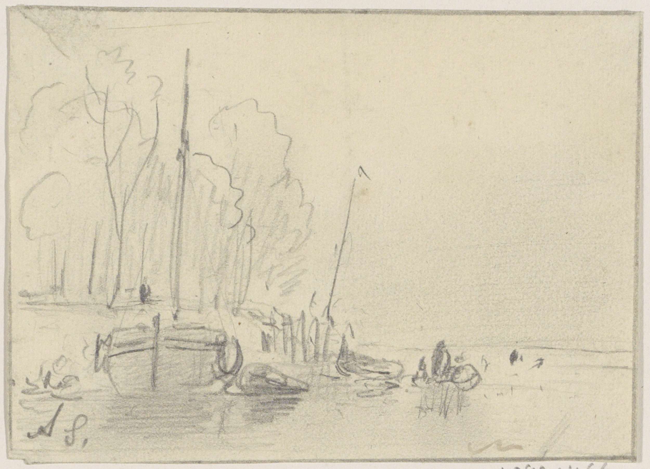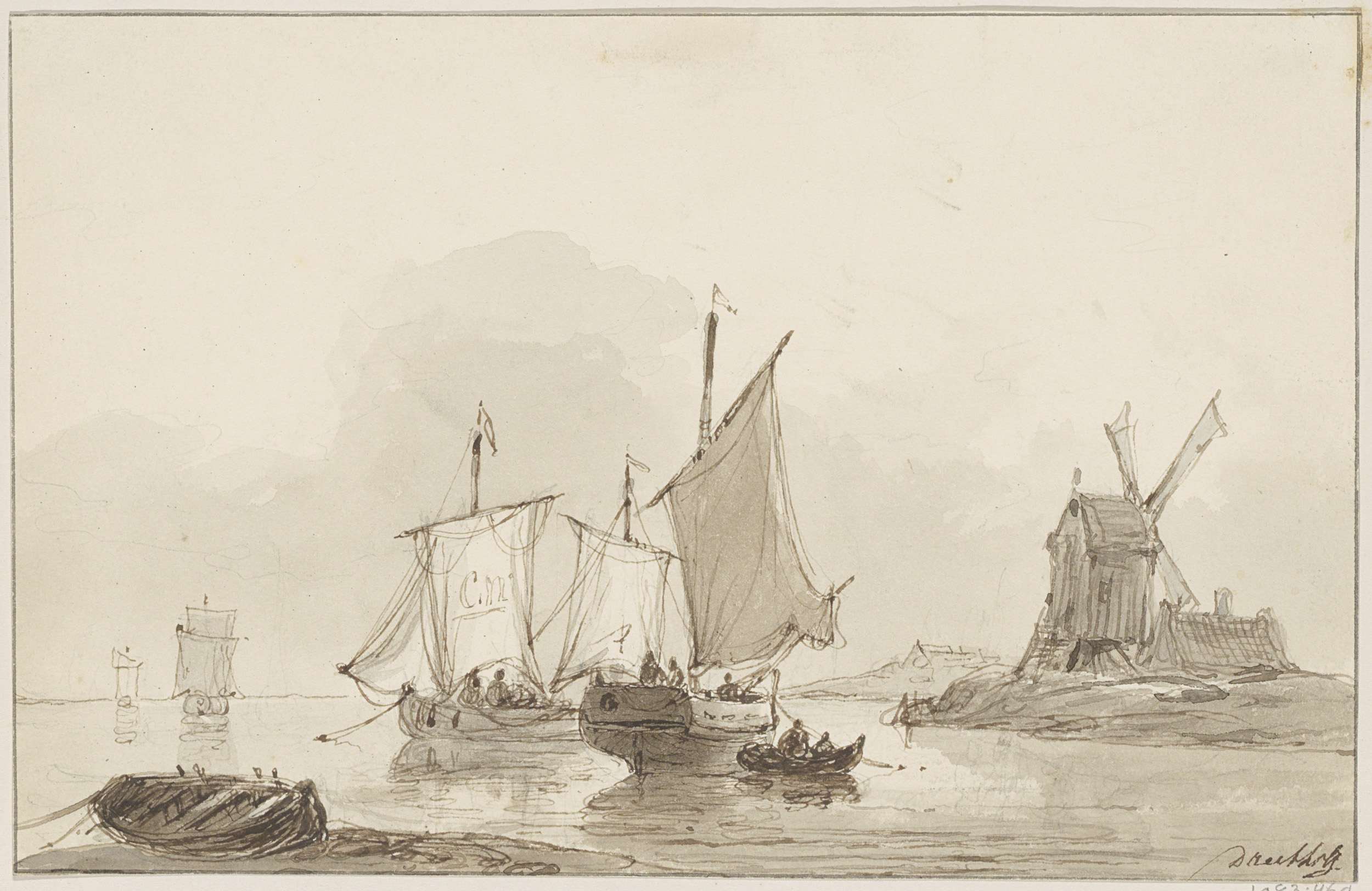 Studieblad met havengezicht, sloep en twee zeilschepen