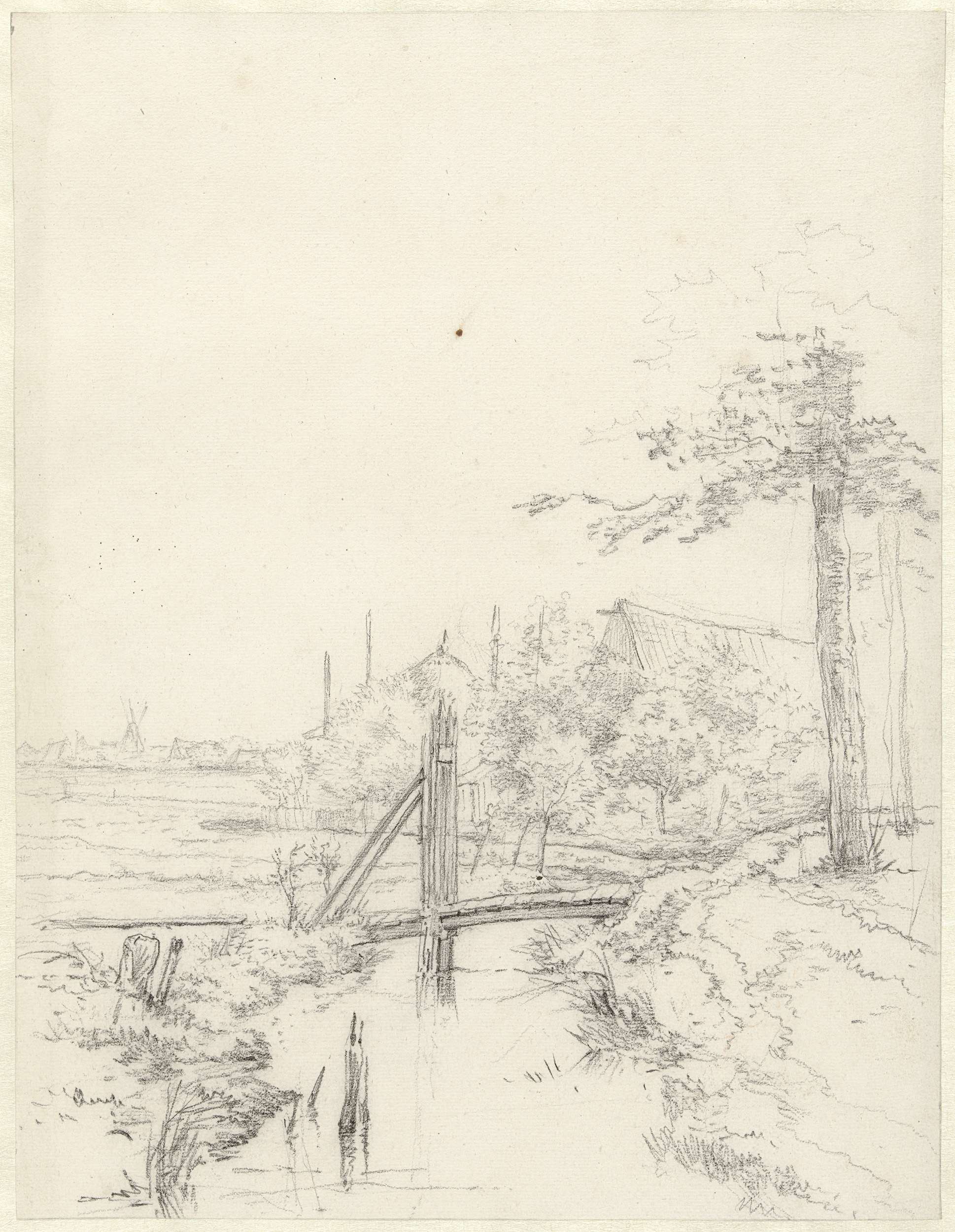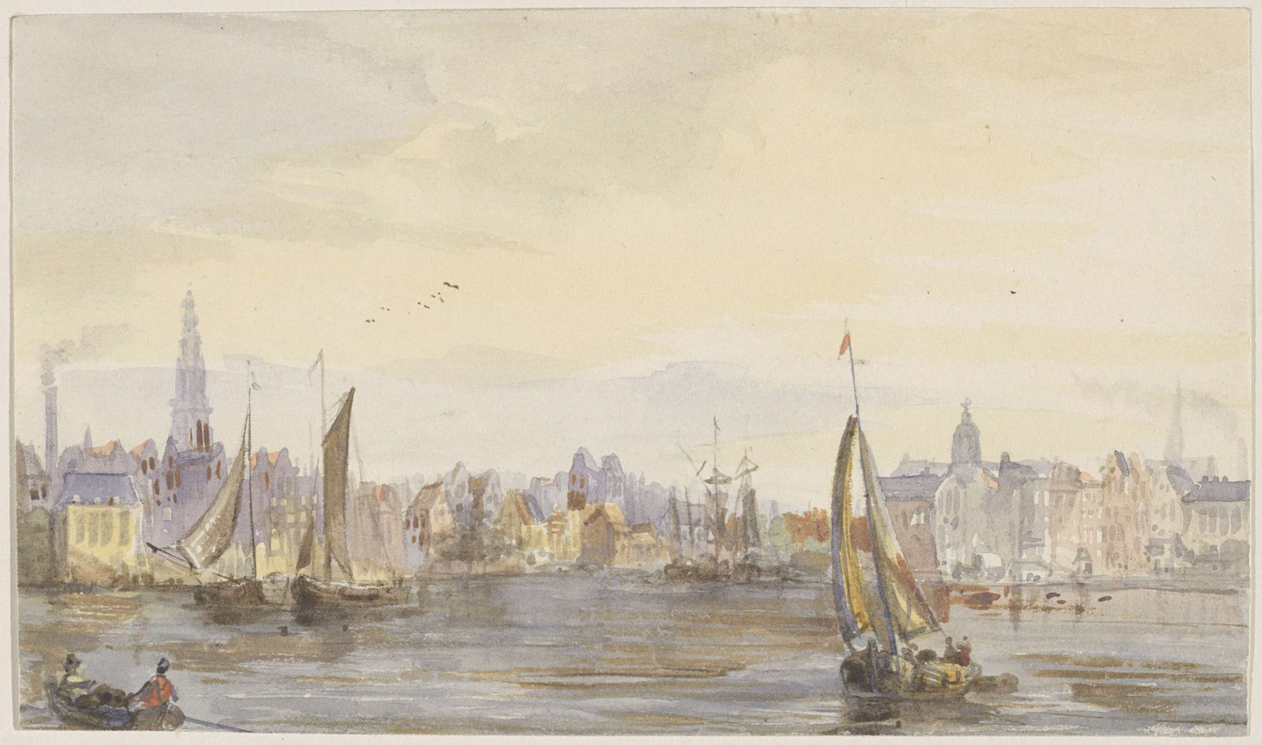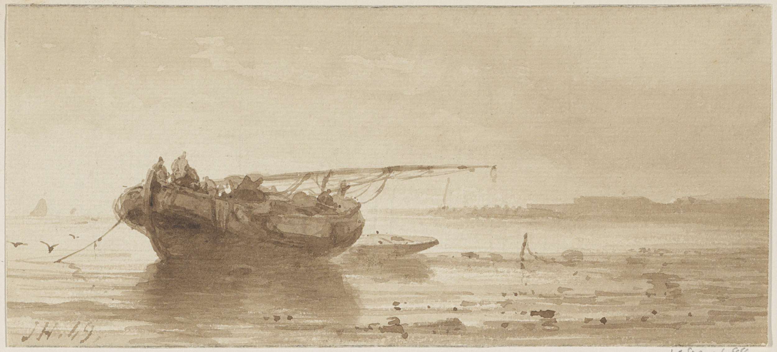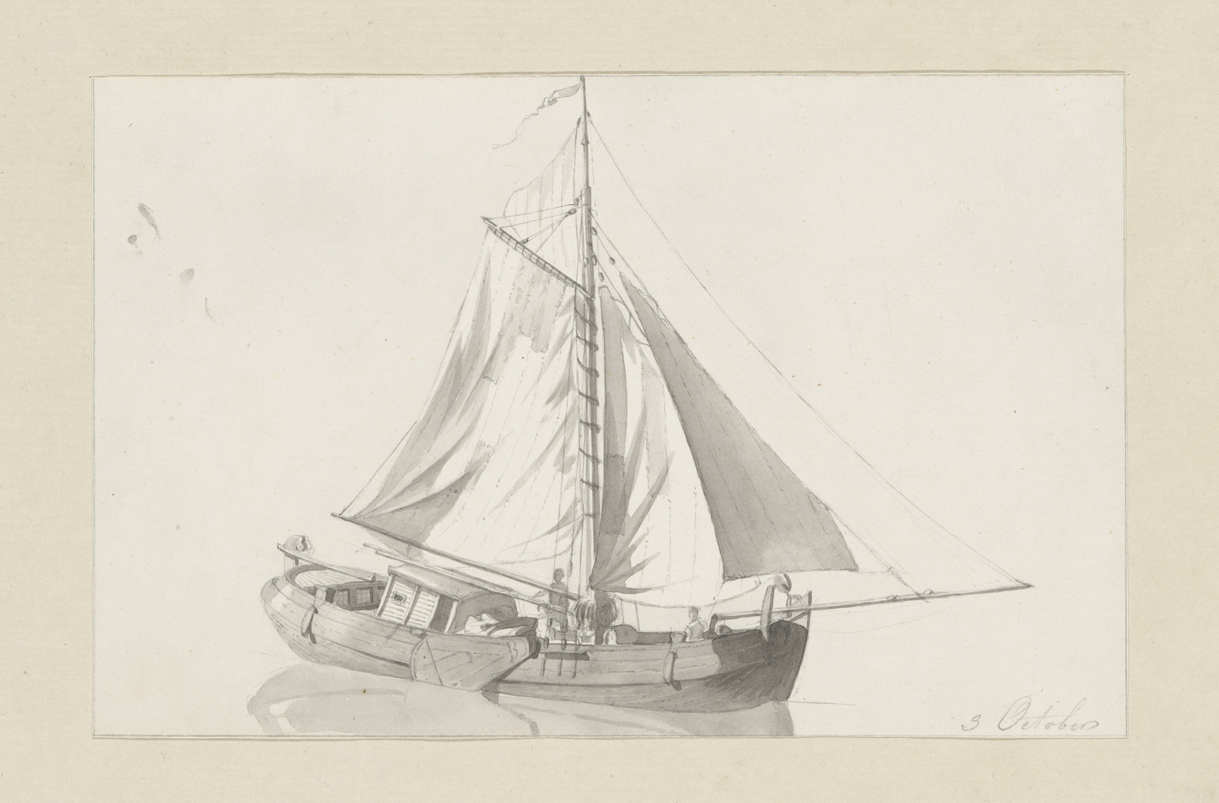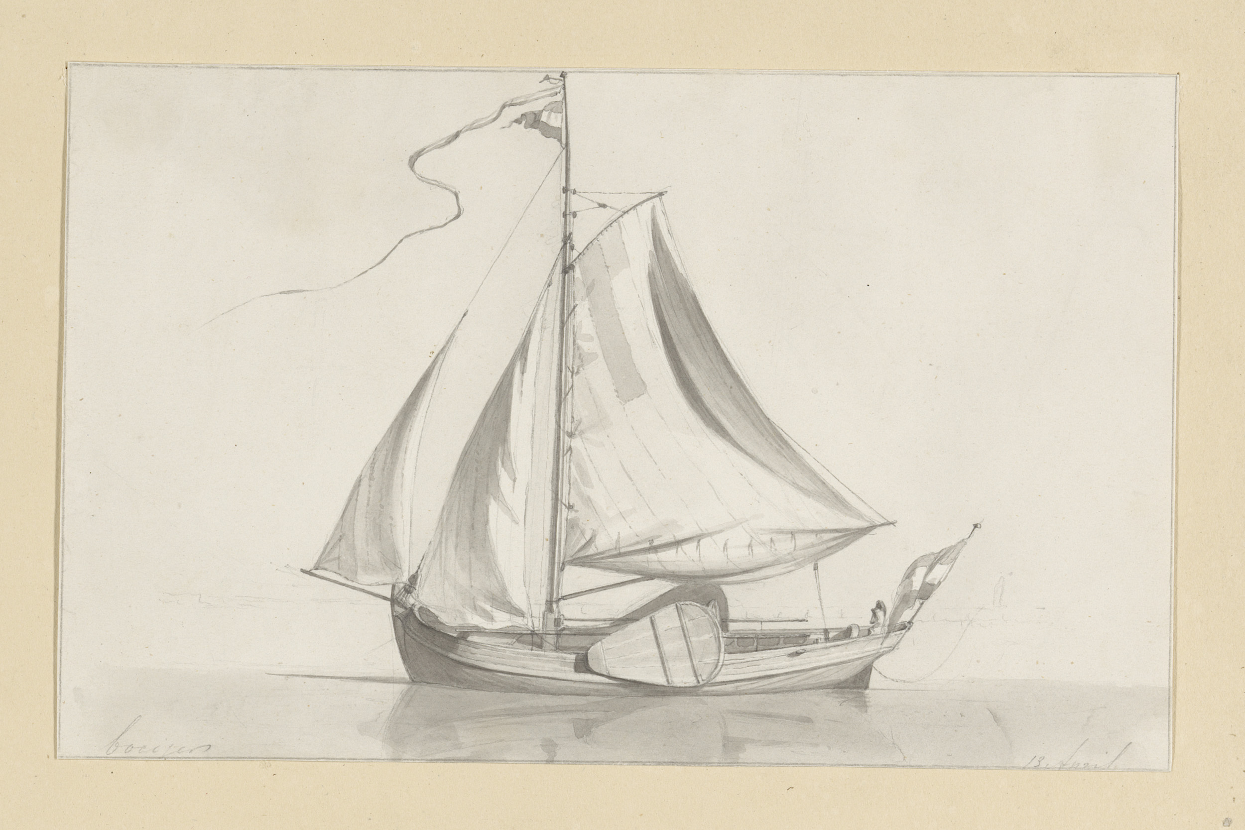 Studieblad met havengezicht, sloep en twee zeilschepen
