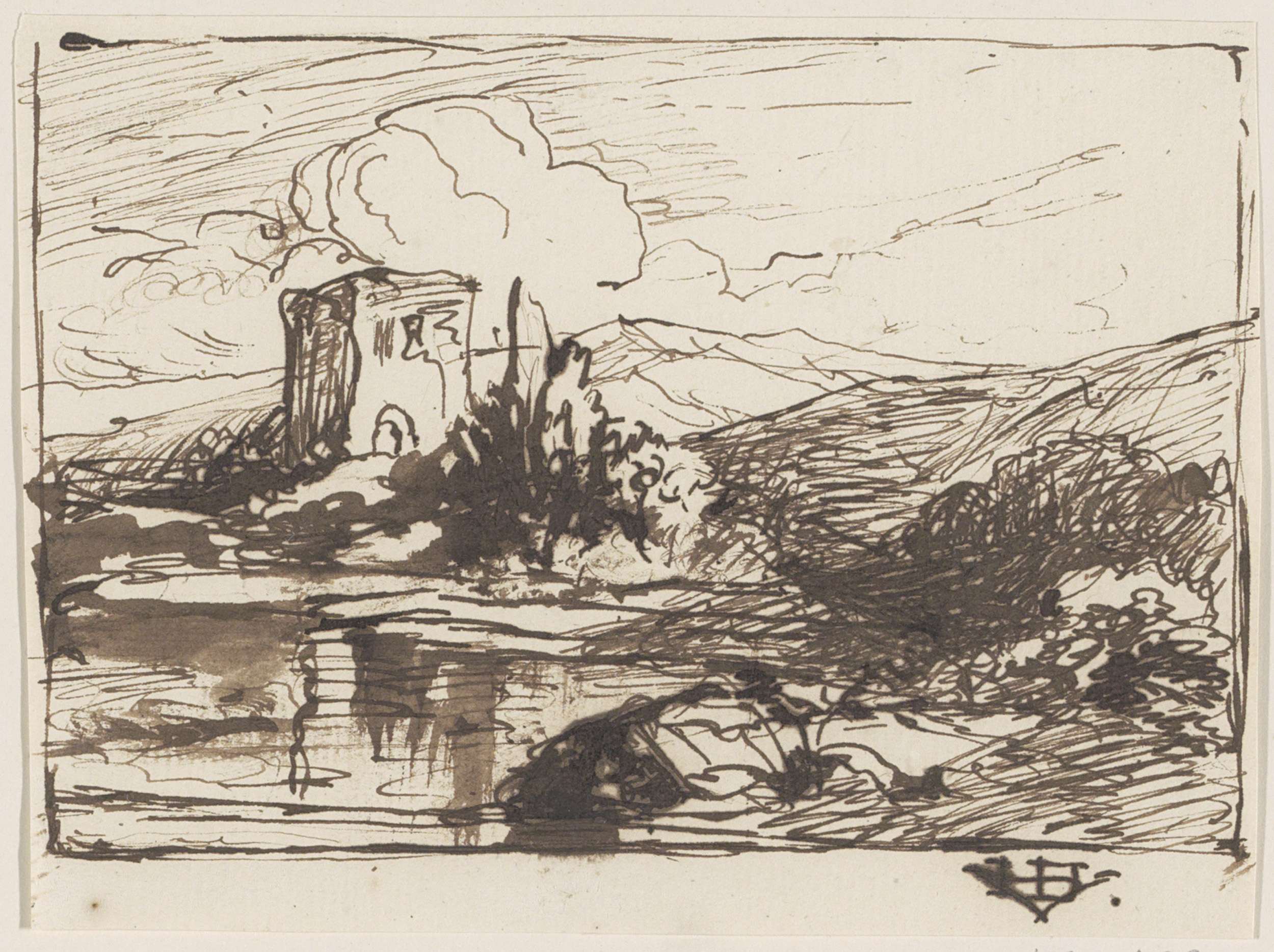 Heuvellandschap met vervallen toren aan een waterkant