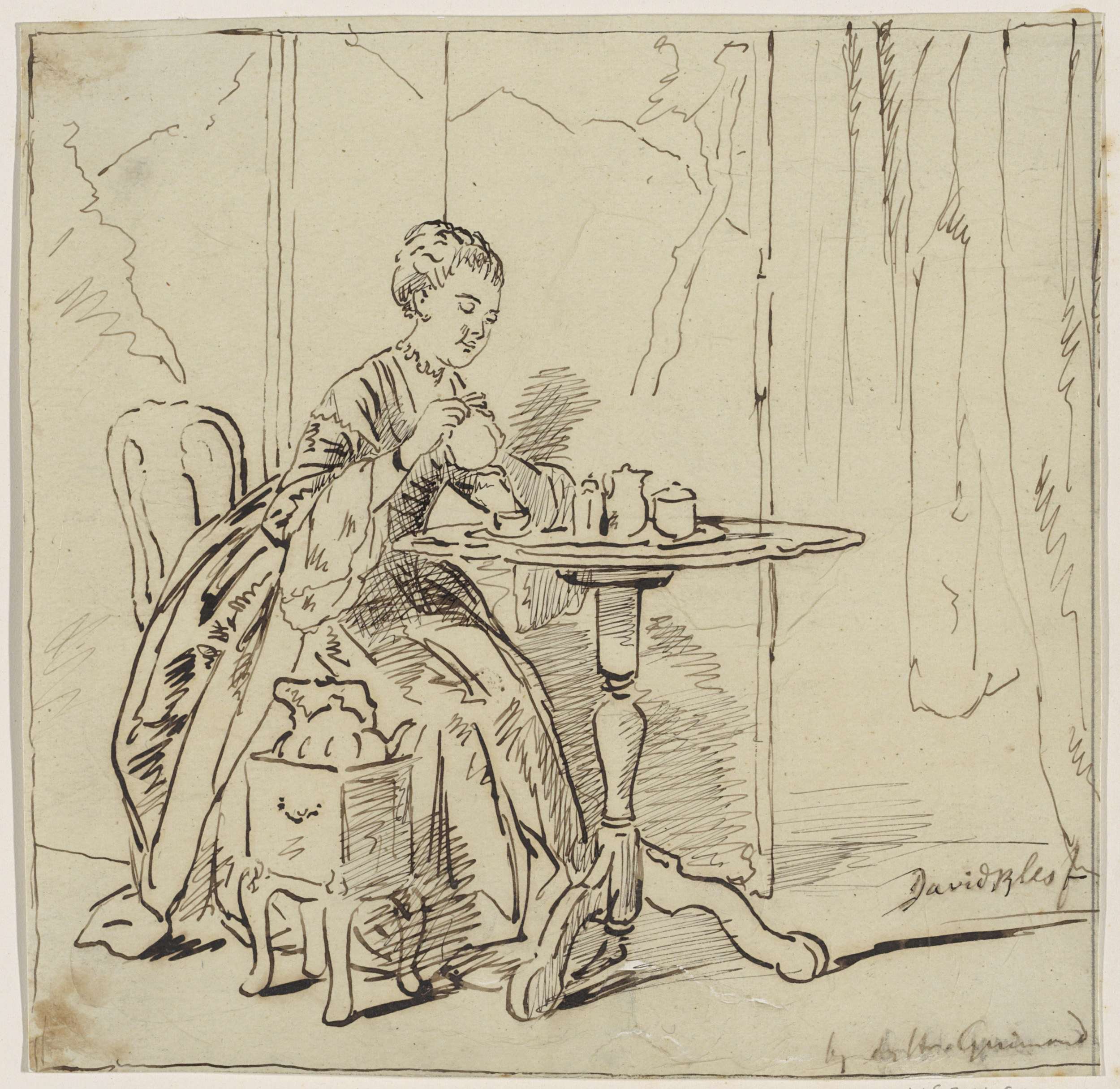 Zittende vrouw aan de thee