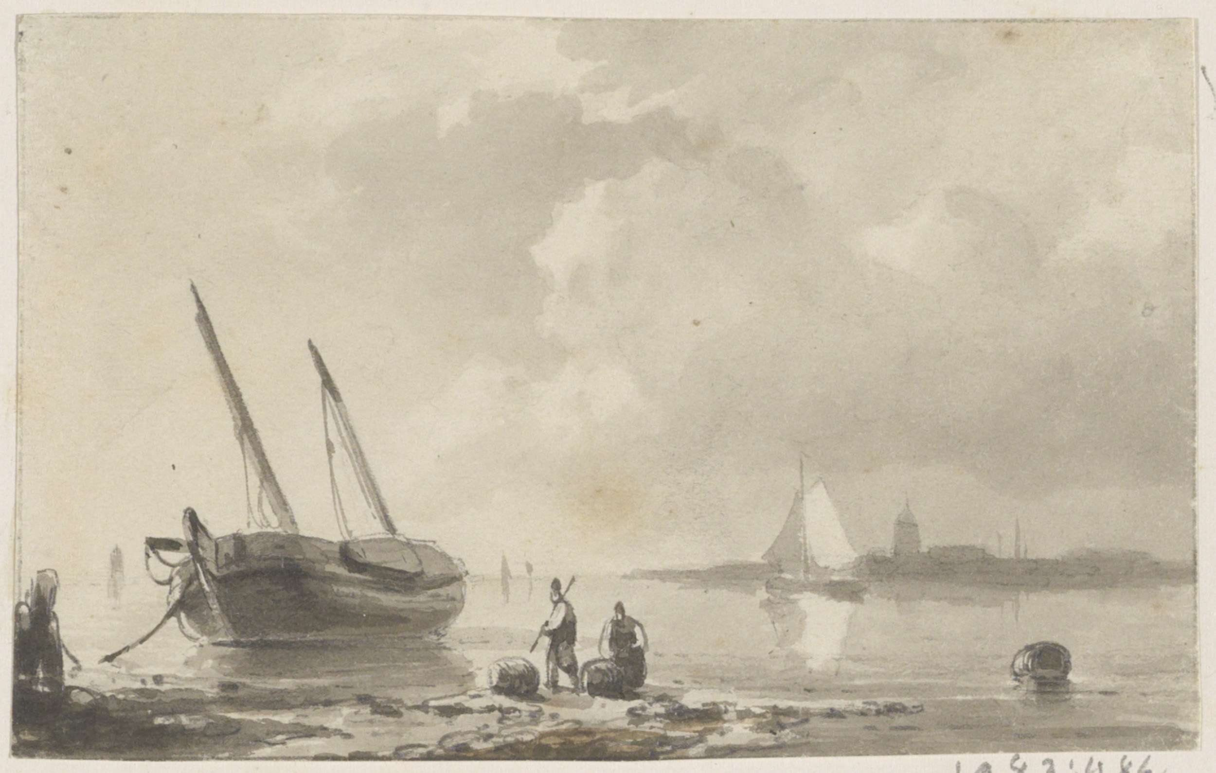 Strandgezicht met figuren bij een schip