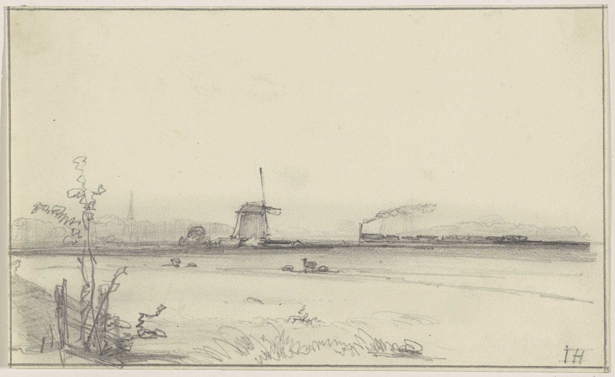 Polderlandschap met molen en stoomtrein
