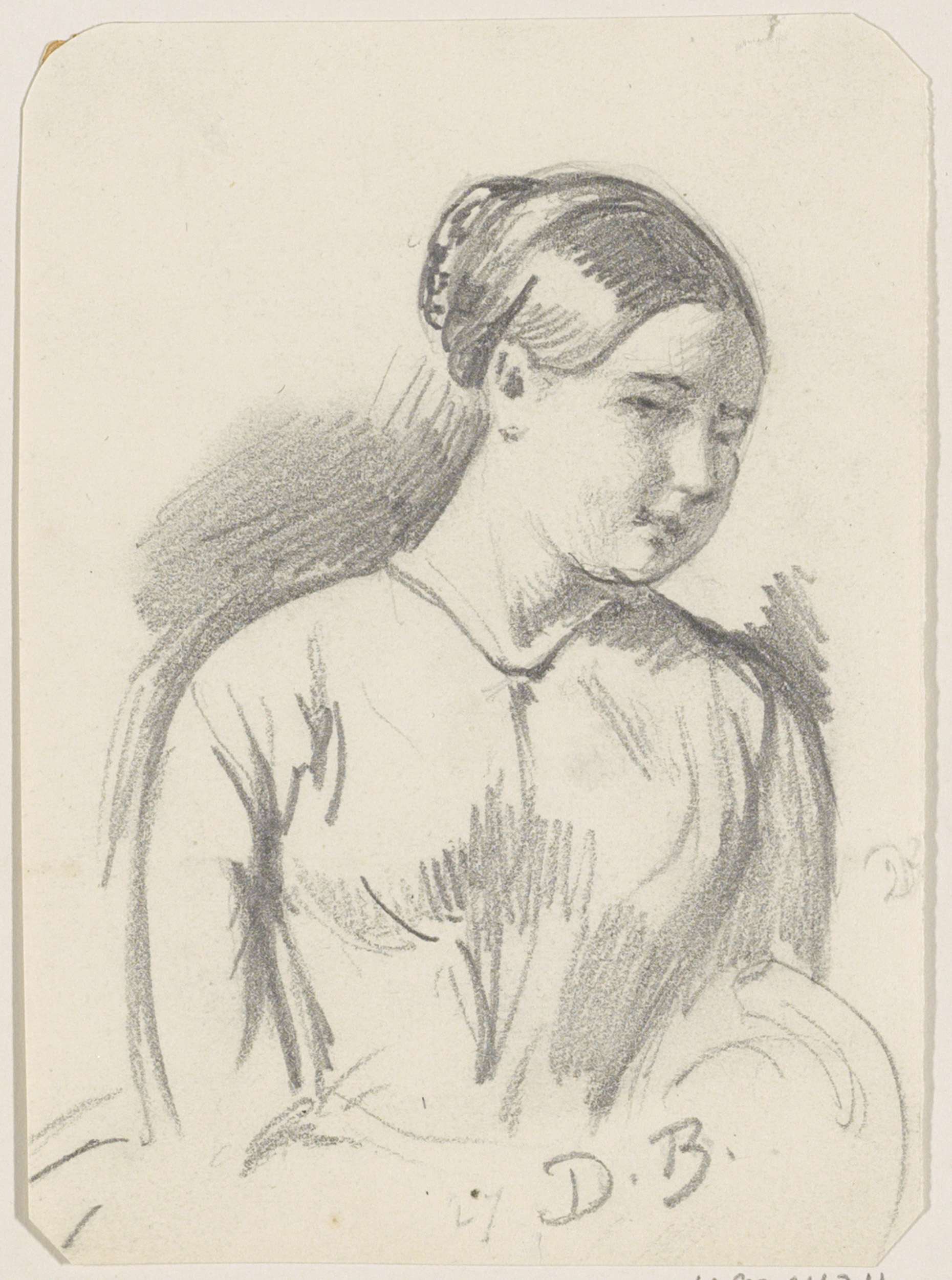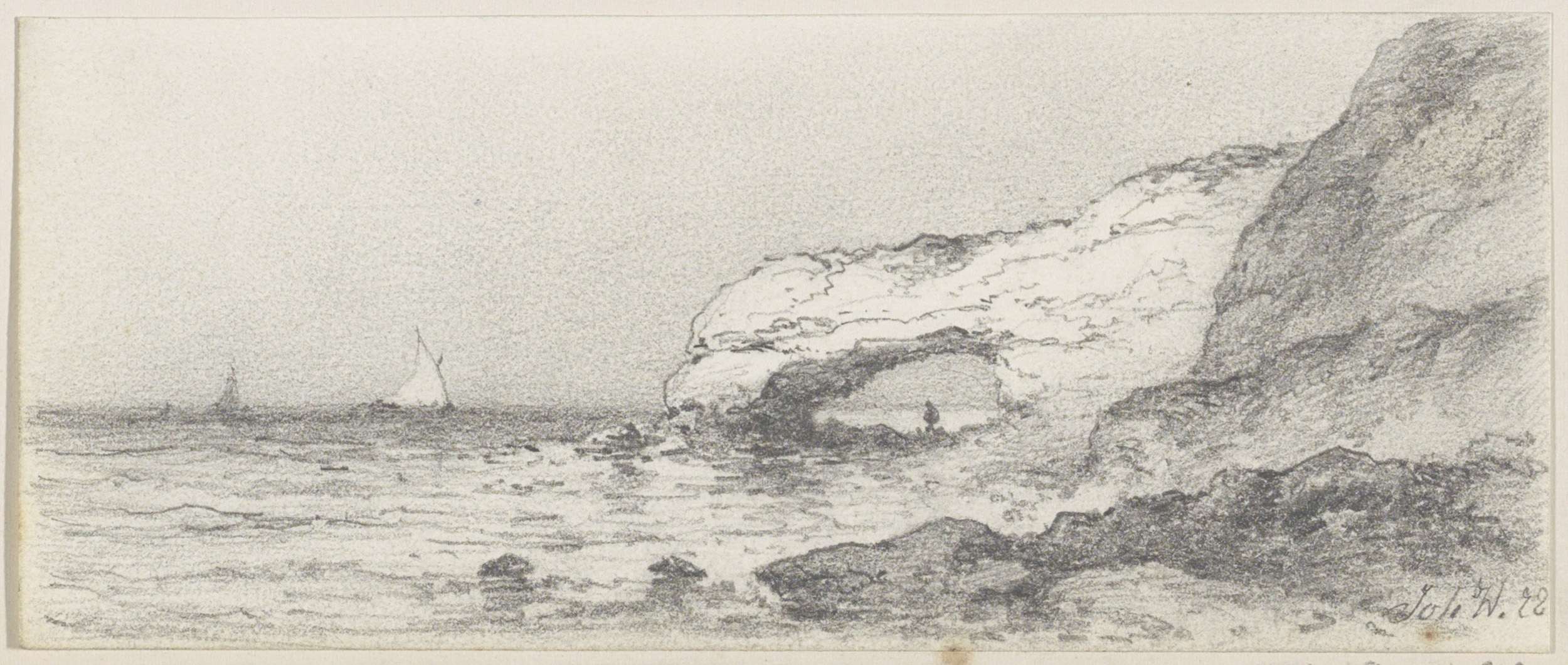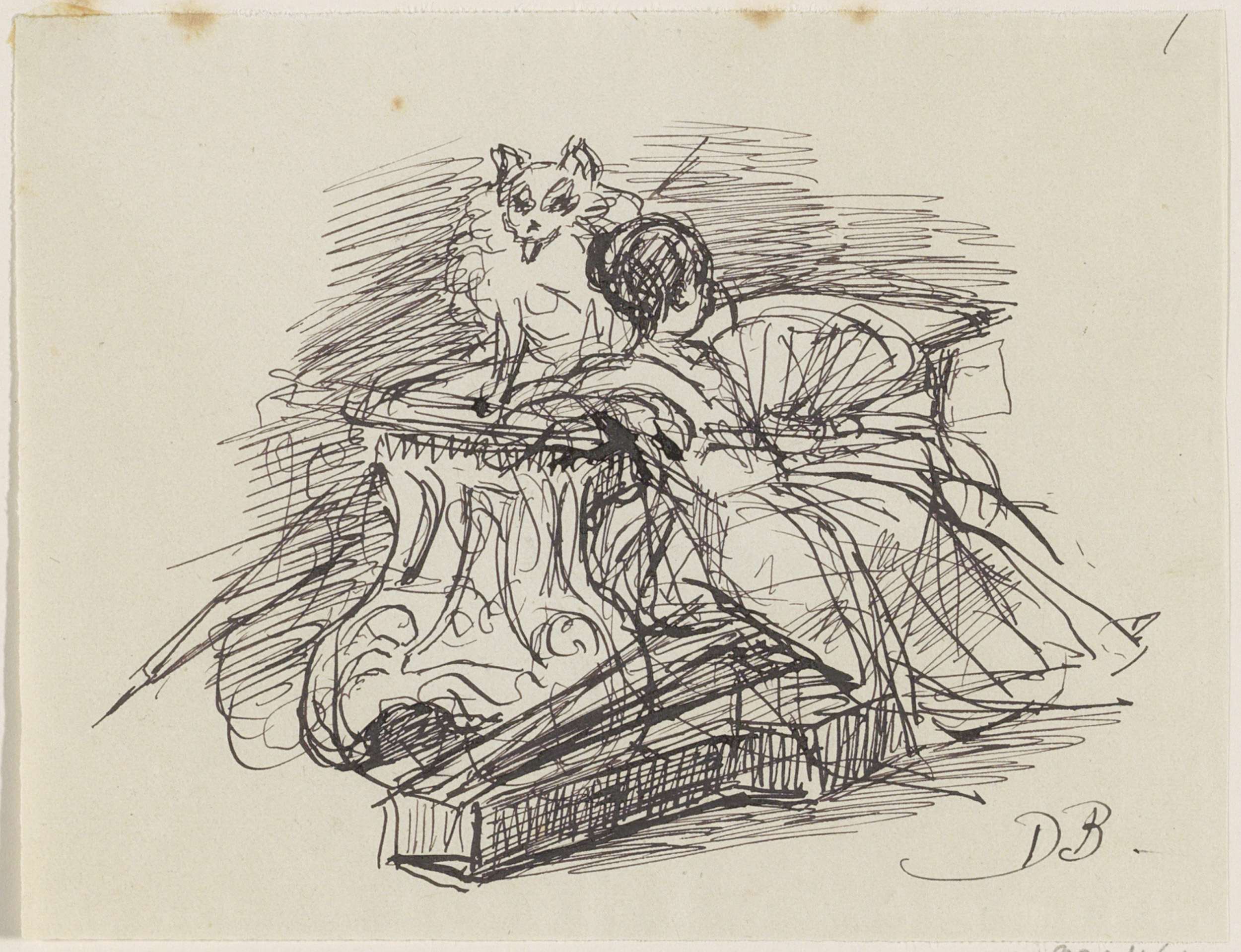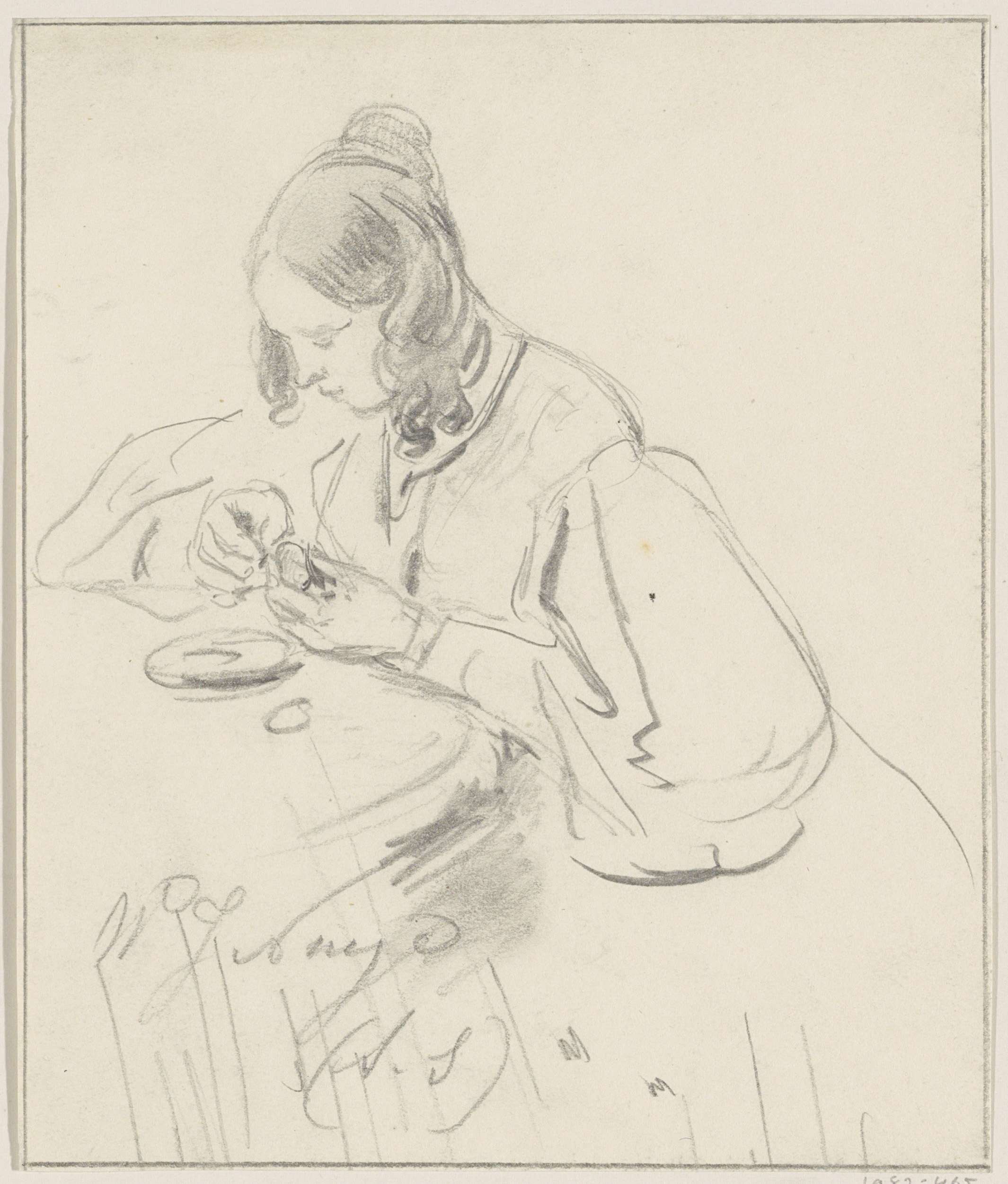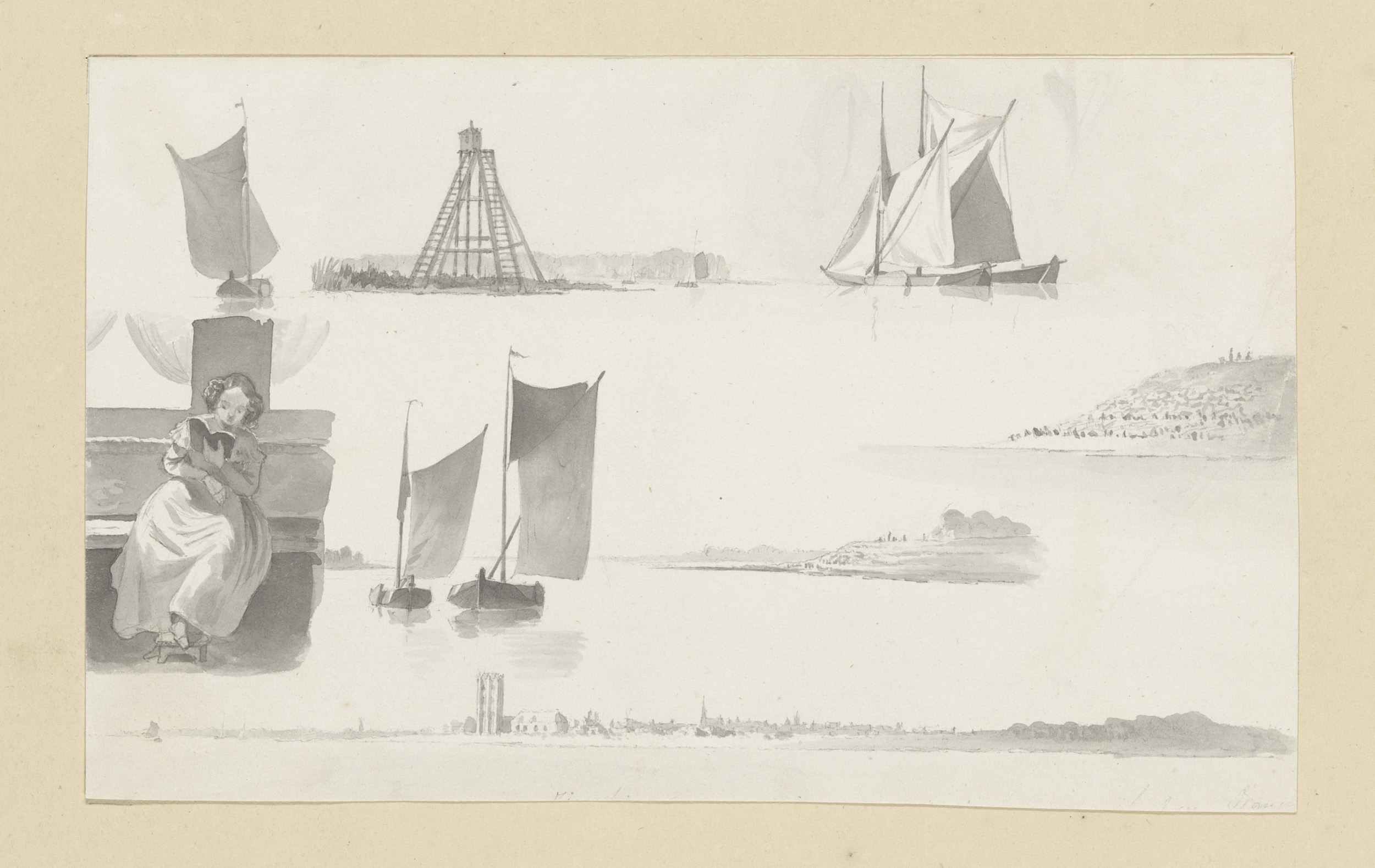 Schetsblad met zittende vrouw en zeilschepen