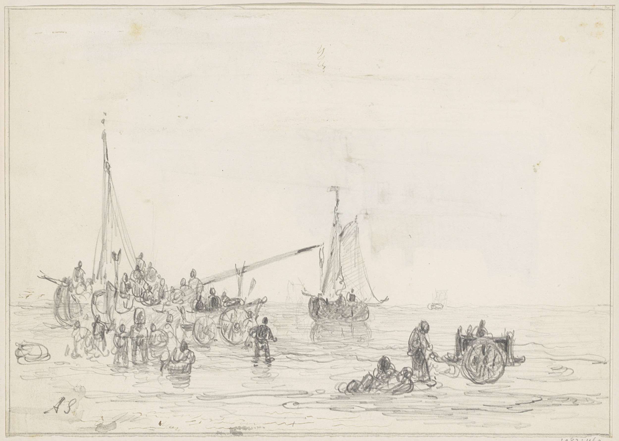 Zeilschepen en figuren op een strand