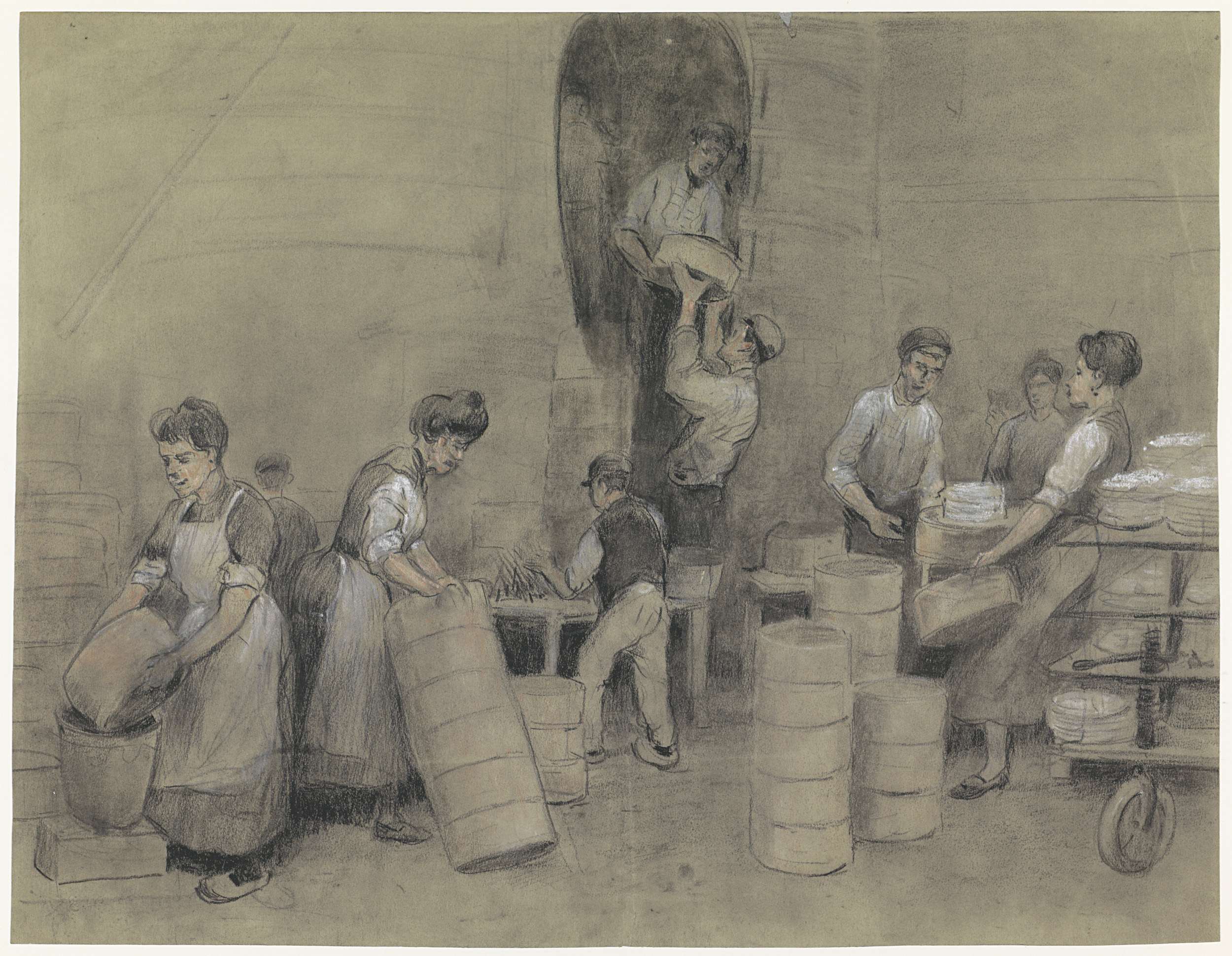 Het uithalen van het aardewerk uit de oven van De Sp...