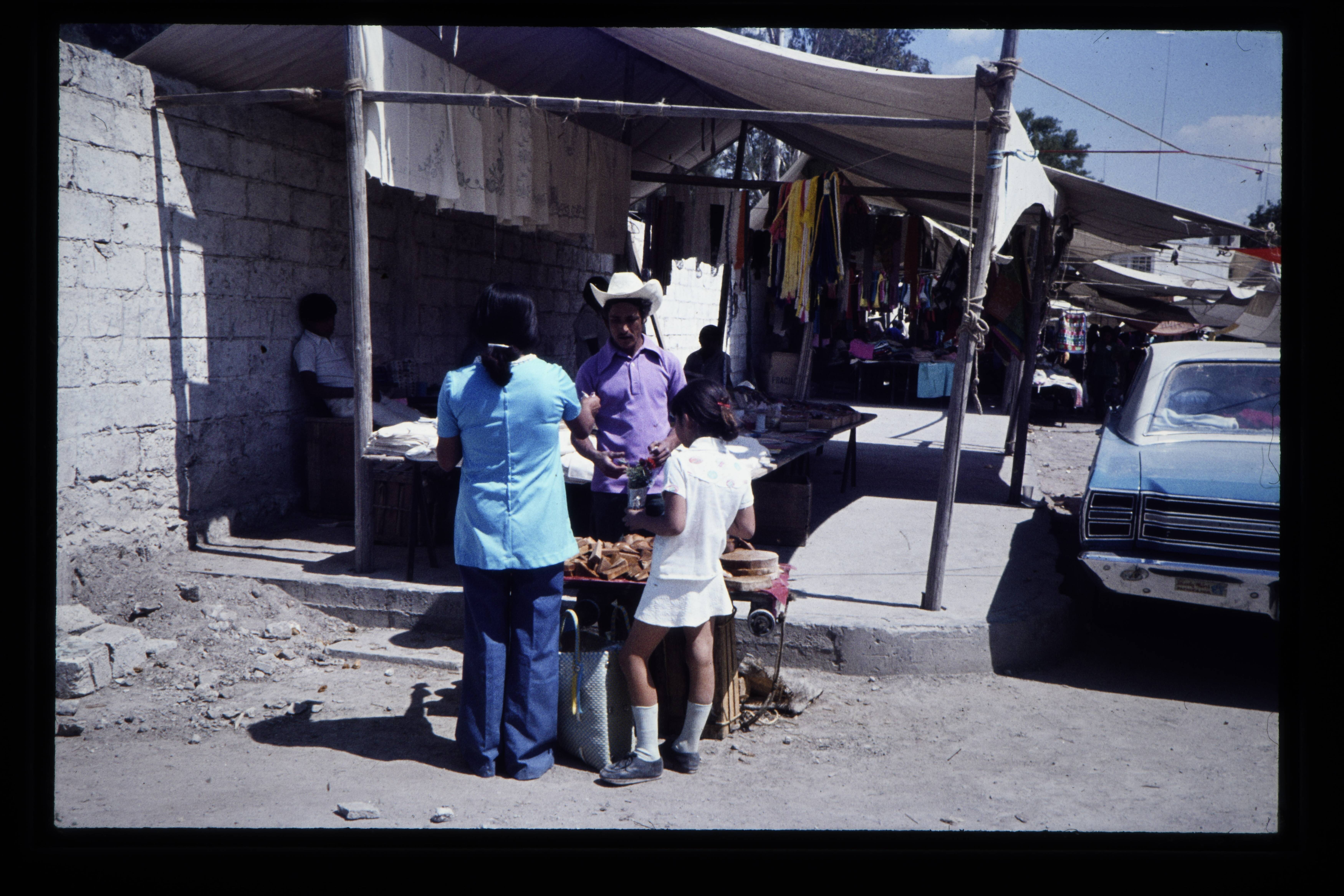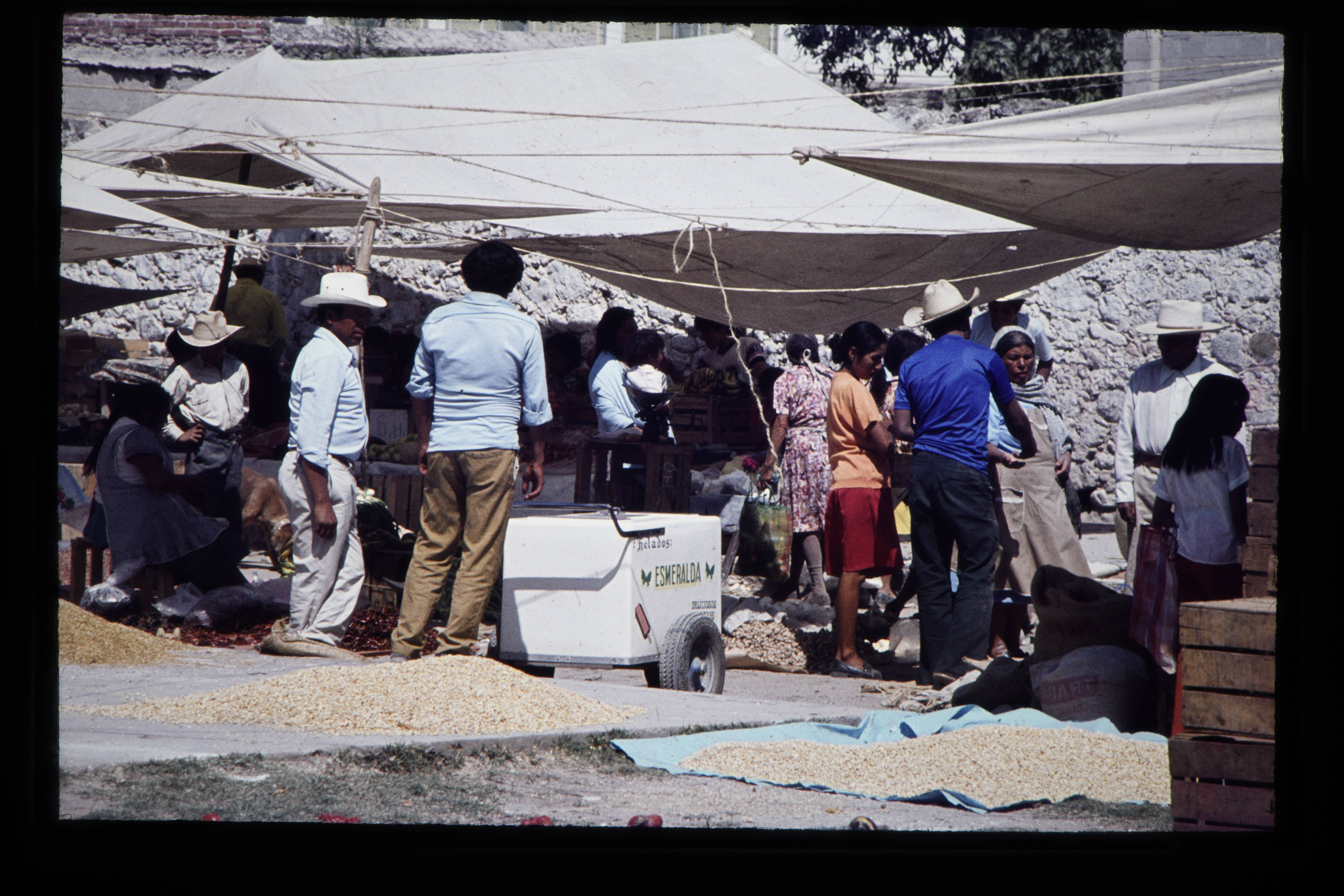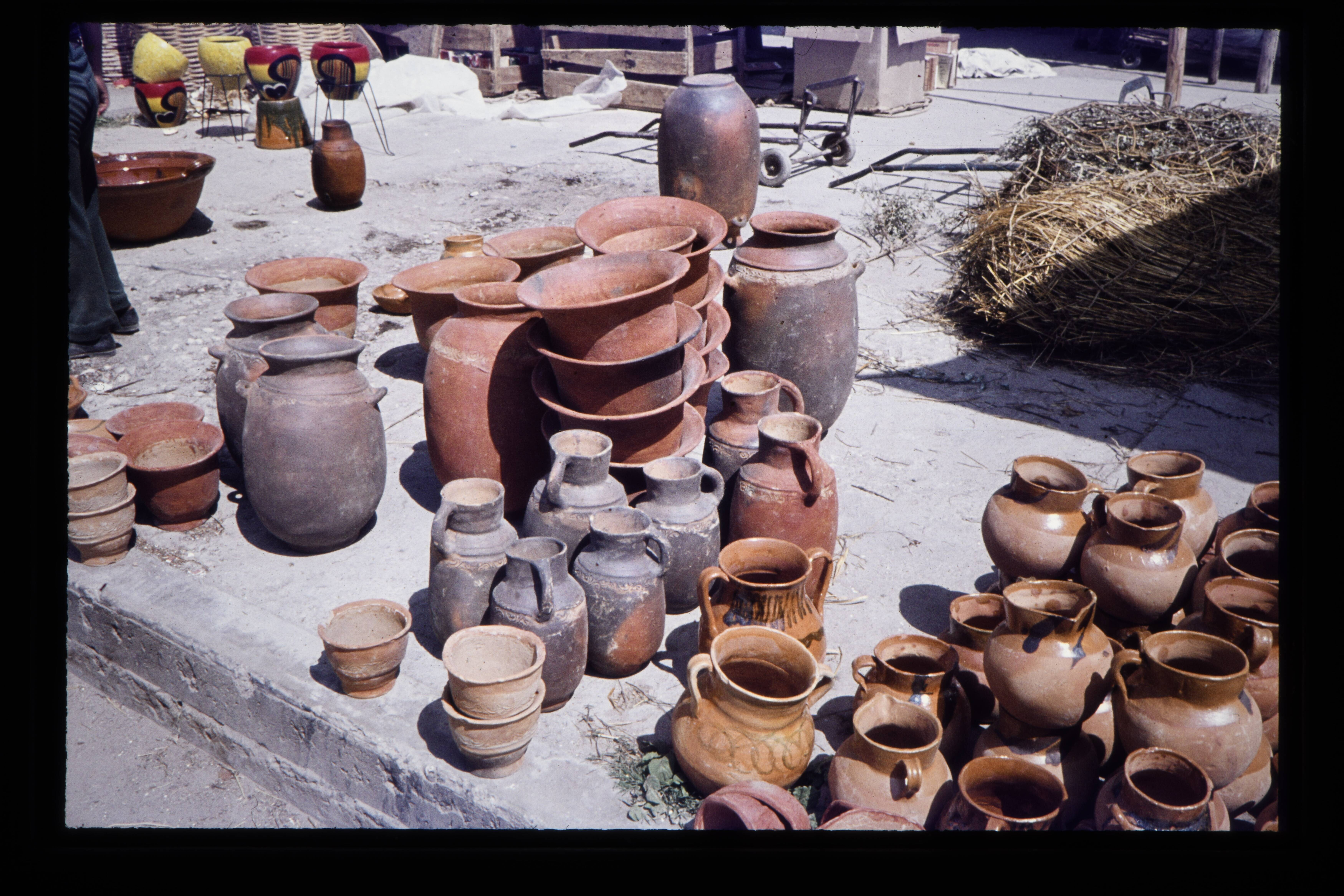 'Verkoop van chilipepers en aardewerk op de markt in...