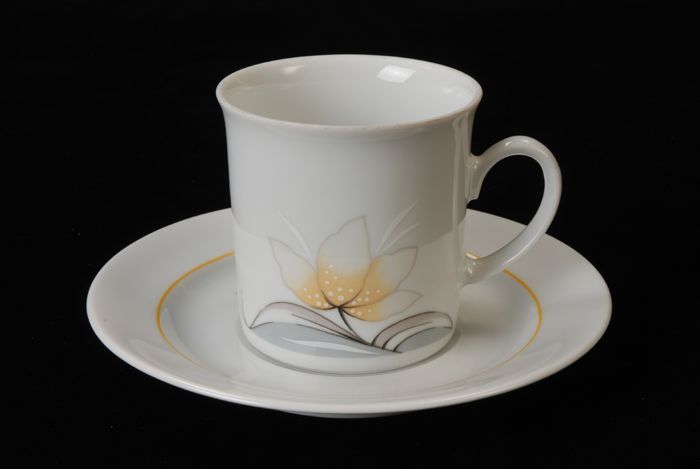 Kop en schotel van Van Nelle met afbeelding van gele...