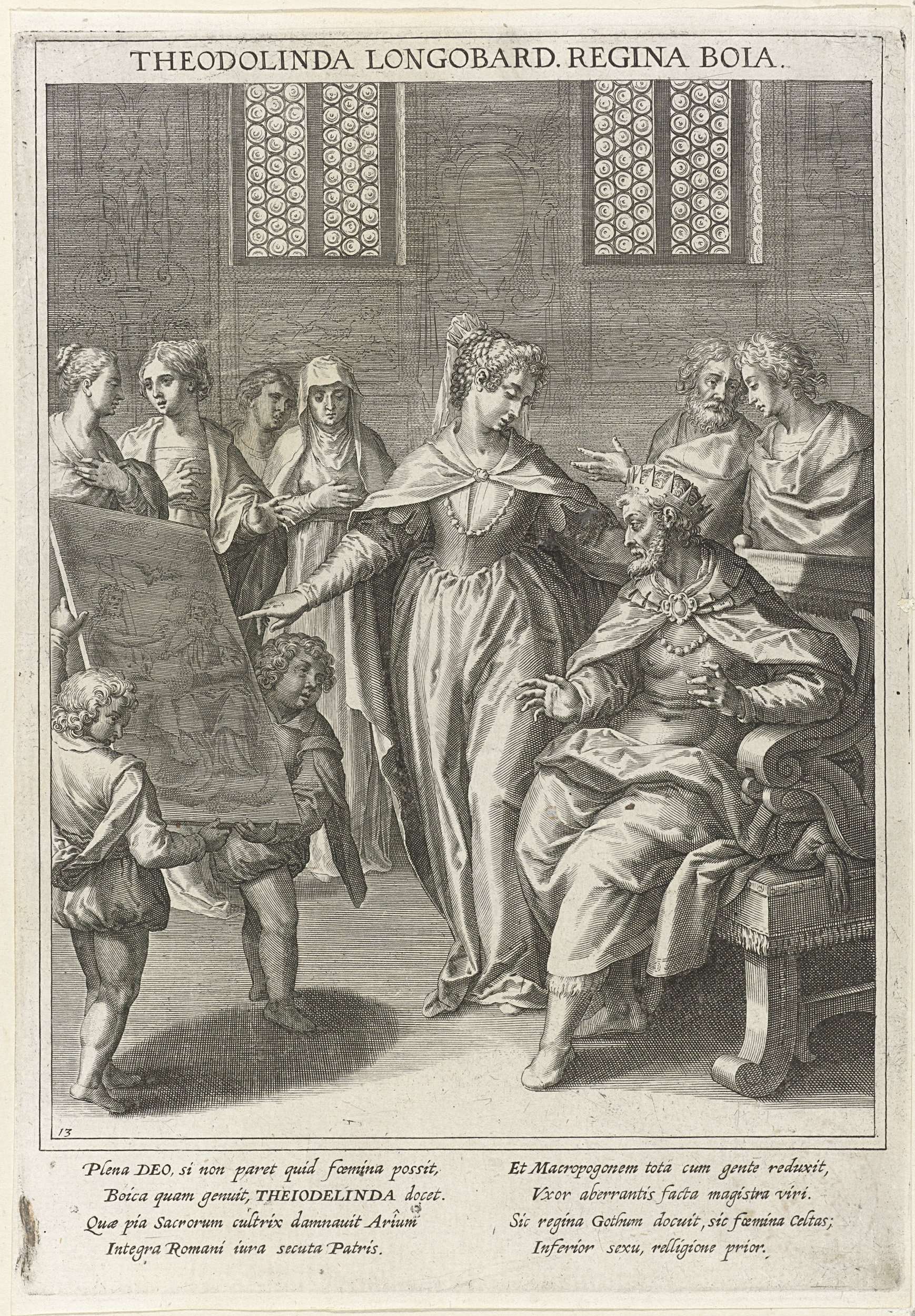 Gundeberga, koningin van de Lombarden, kijkt naar he...