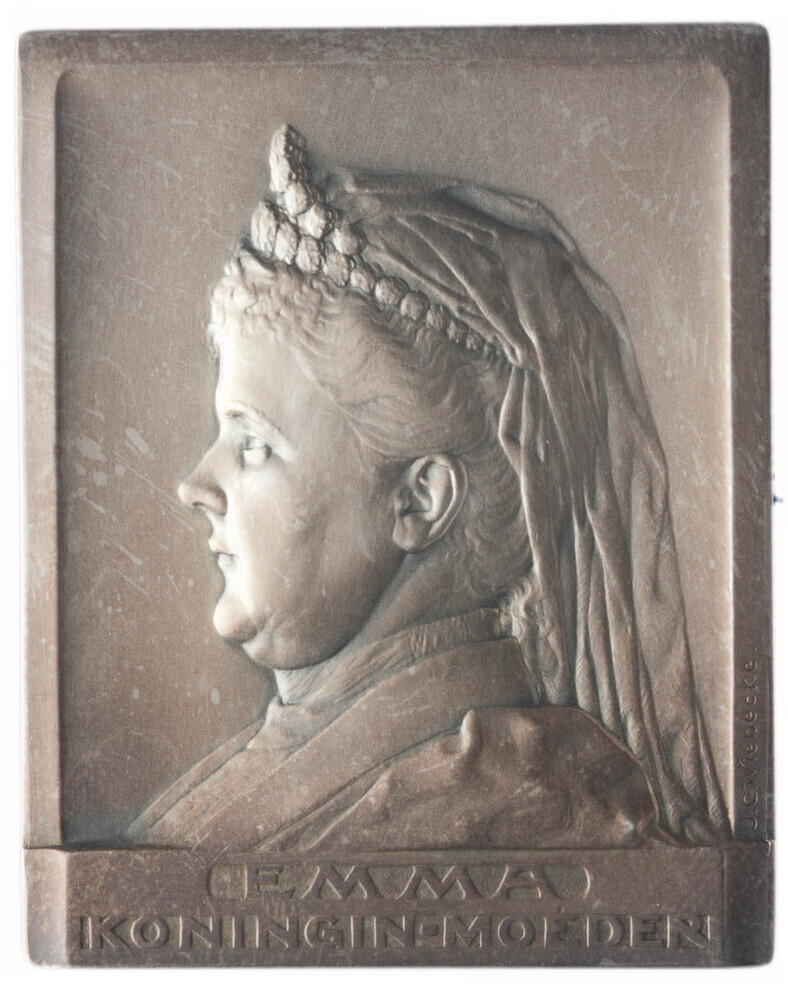 Koningin Wilhelmina (met regentes koningin Emma op d...