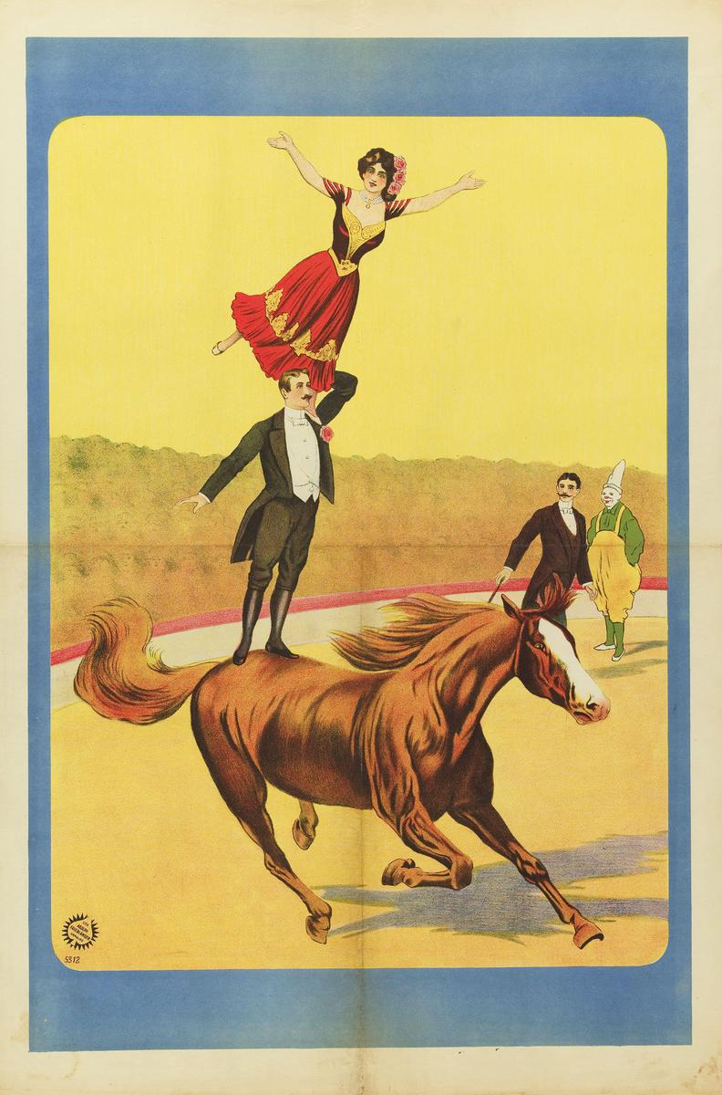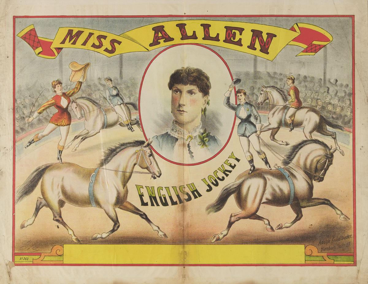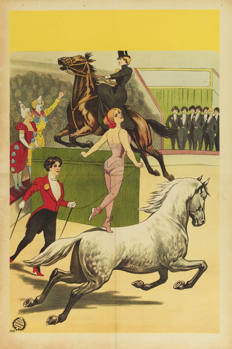 Vrouwen-circus; vrouwen te paard, vrouwelijke clowns