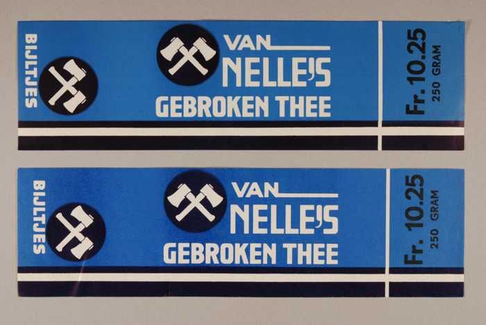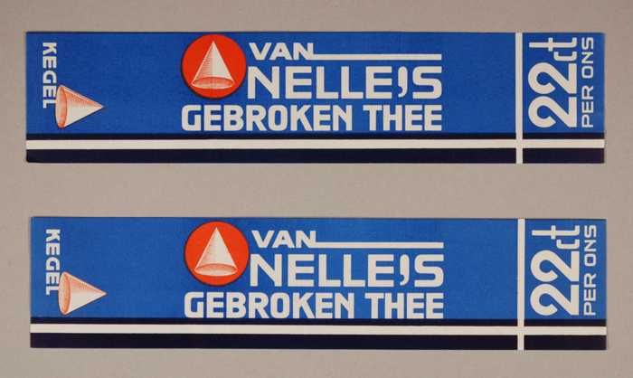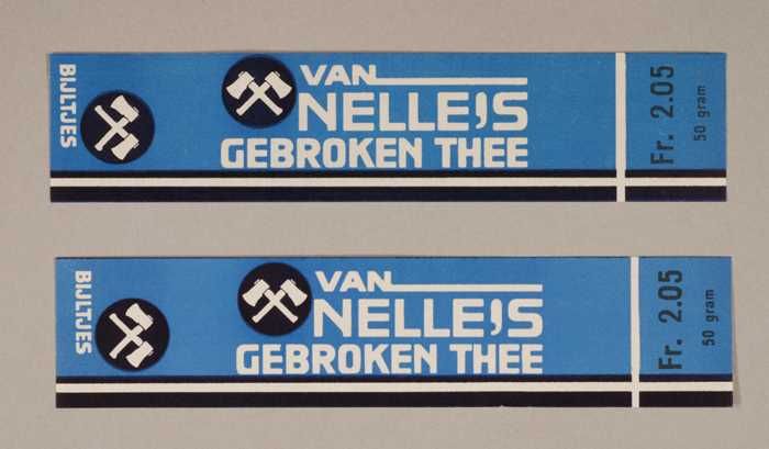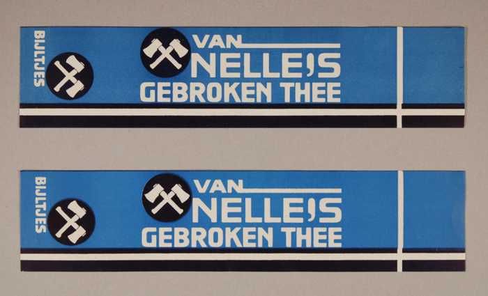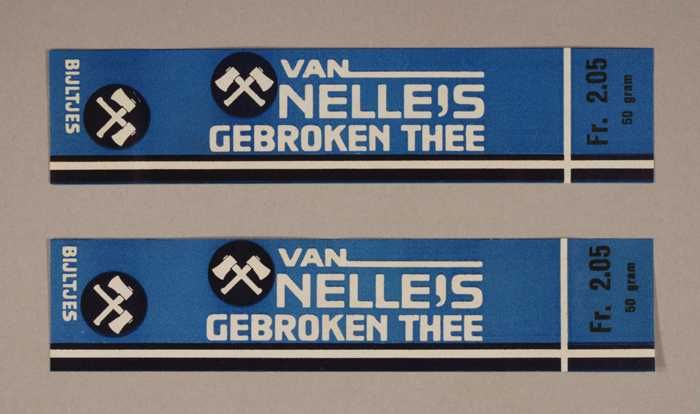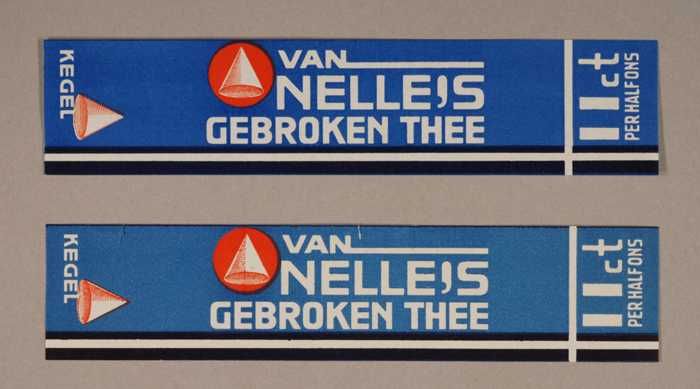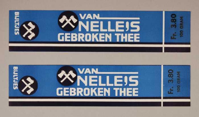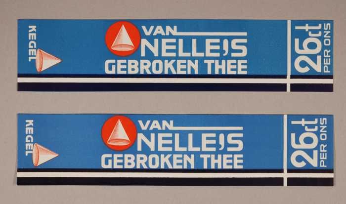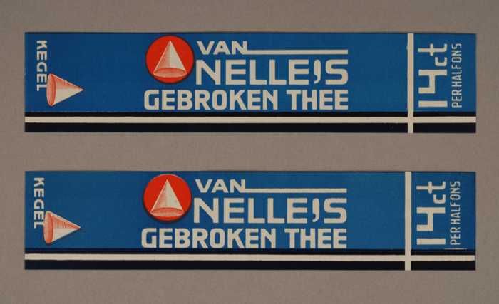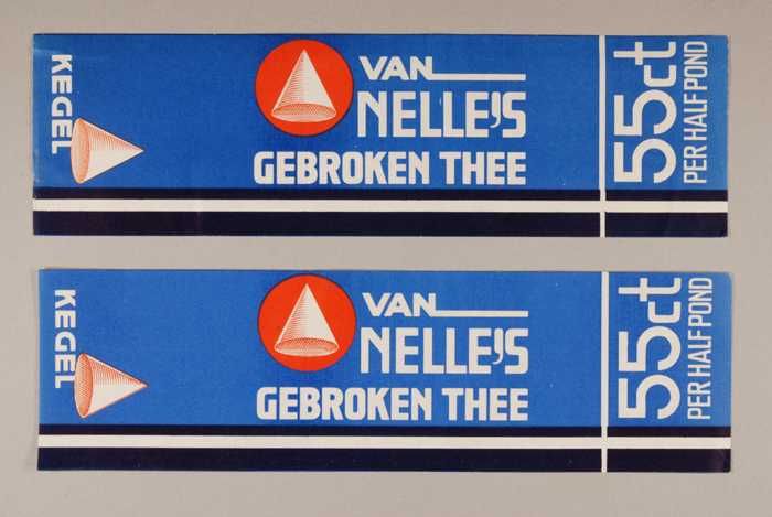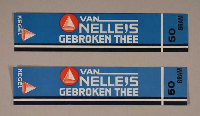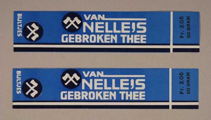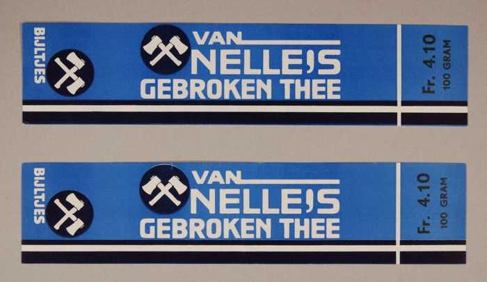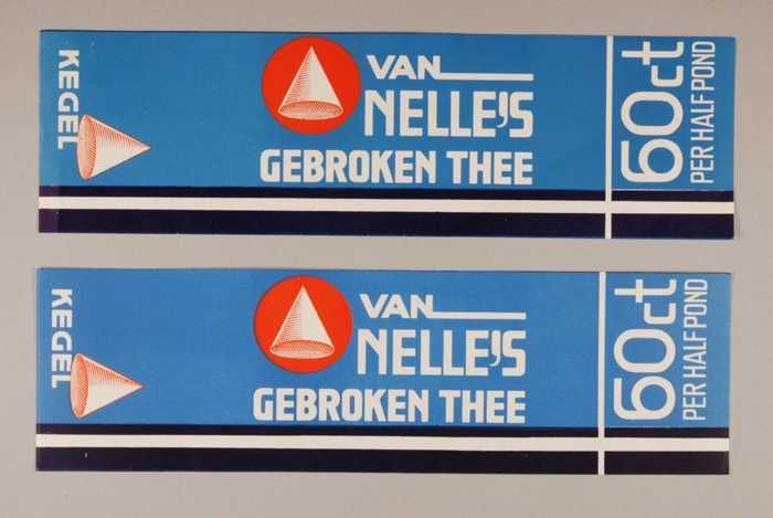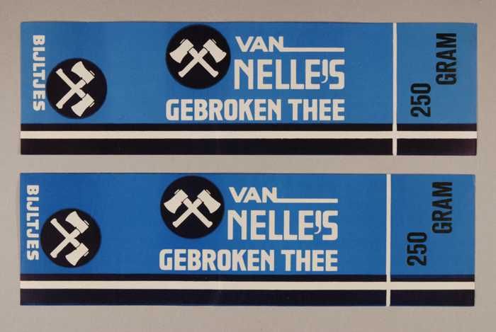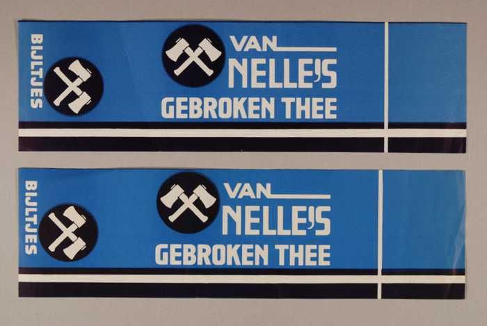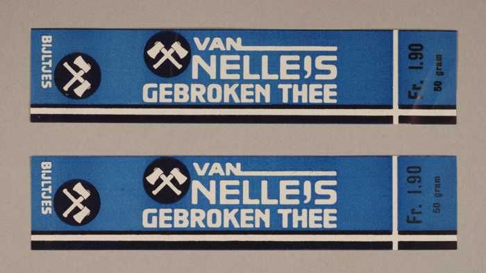 Twee blauwe en rode, papieren labels VAN NELLE'S DE ...