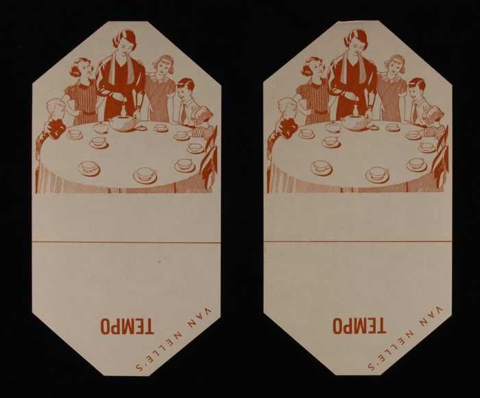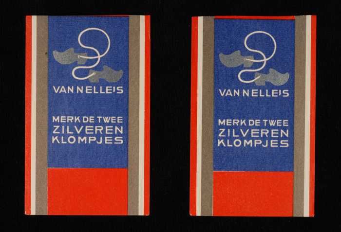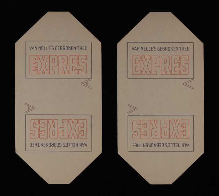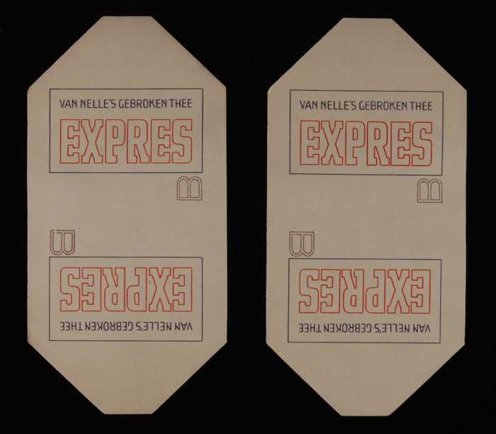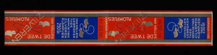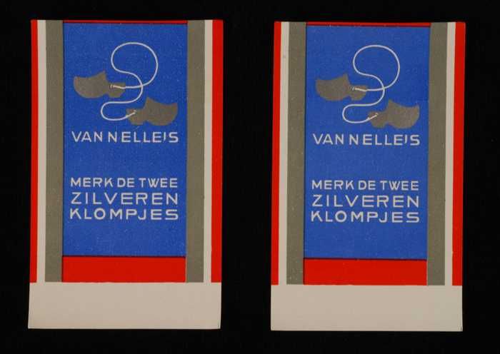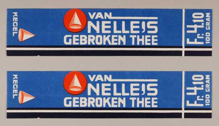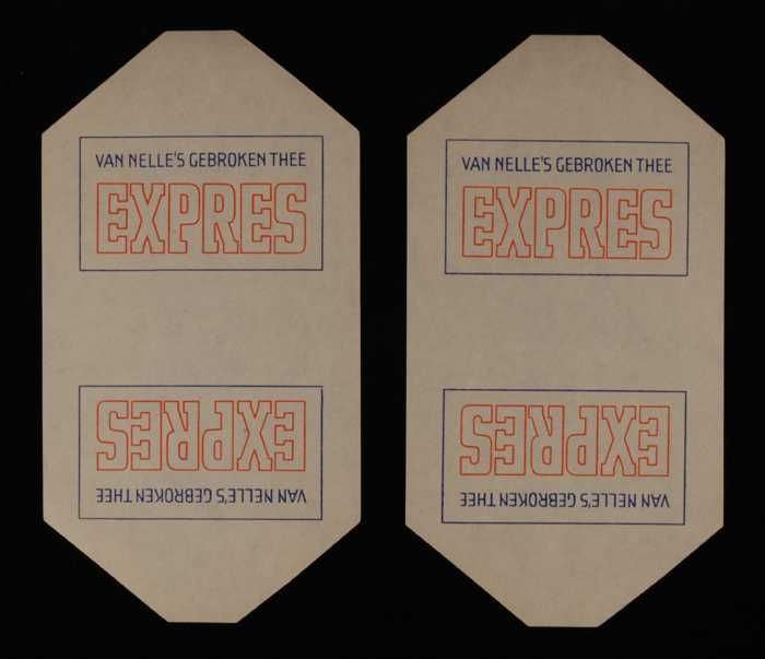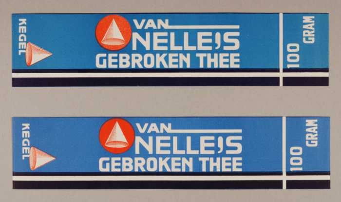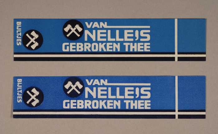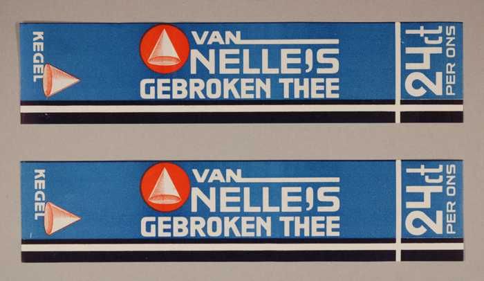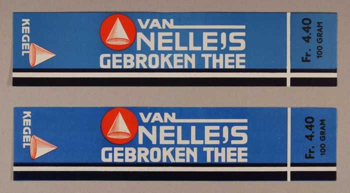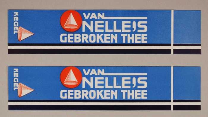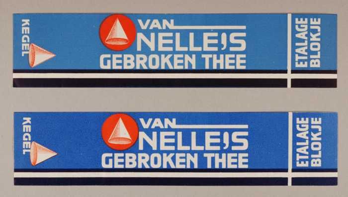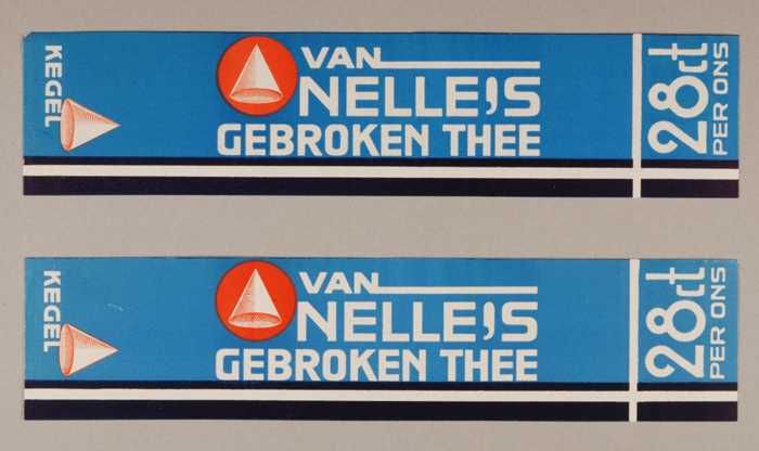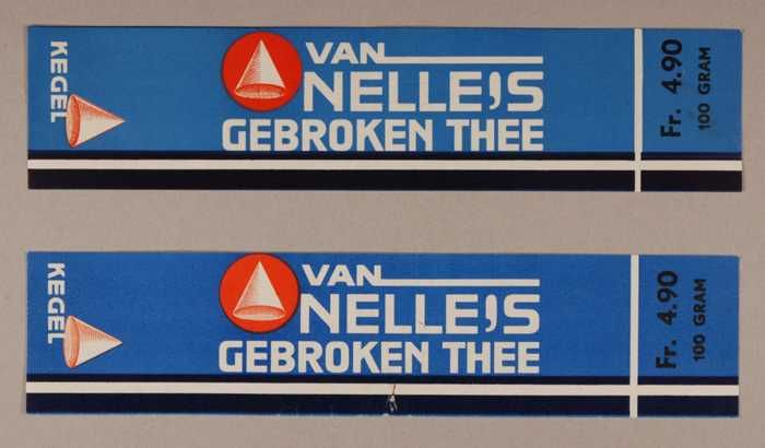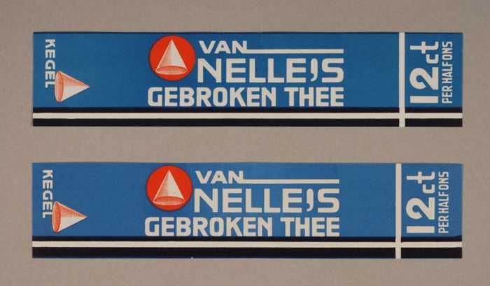 Twee blauwe en rode, papieren labels VAN NELLE'S DE ...
