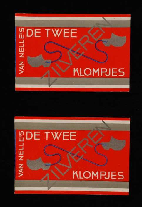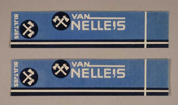 Twee blauwe, papieren labels VAN NELLE'S DE TWEE ZIL...