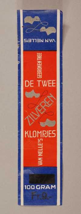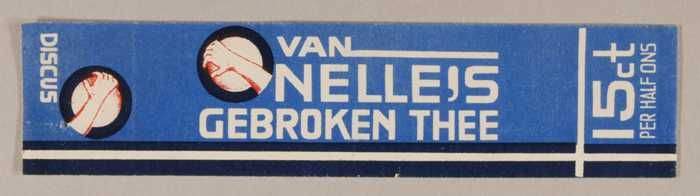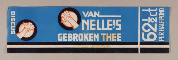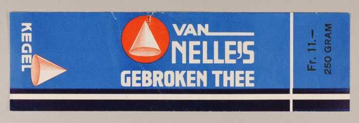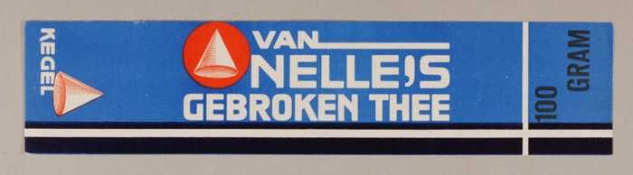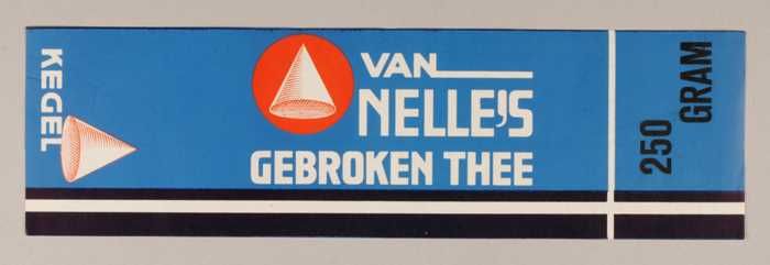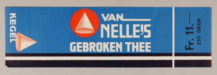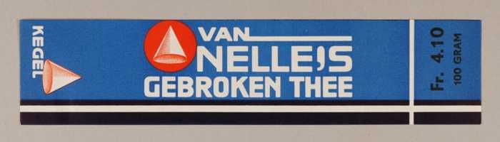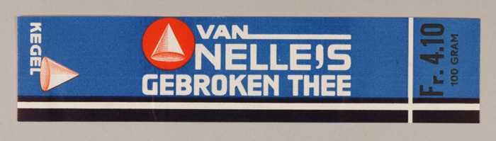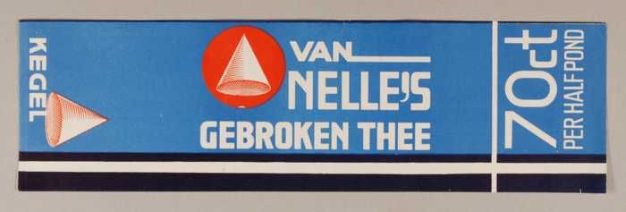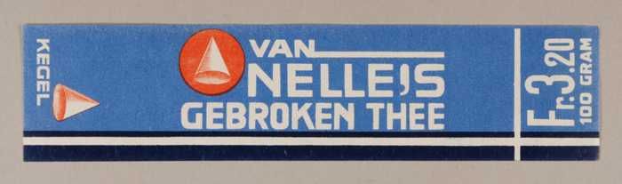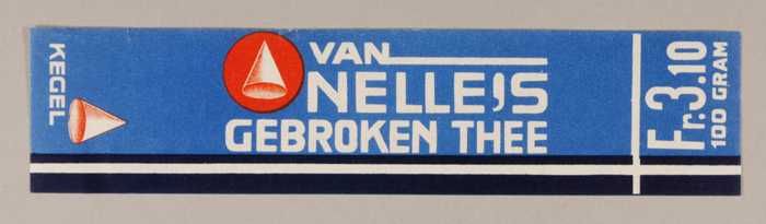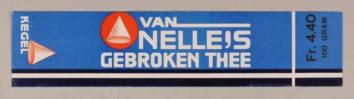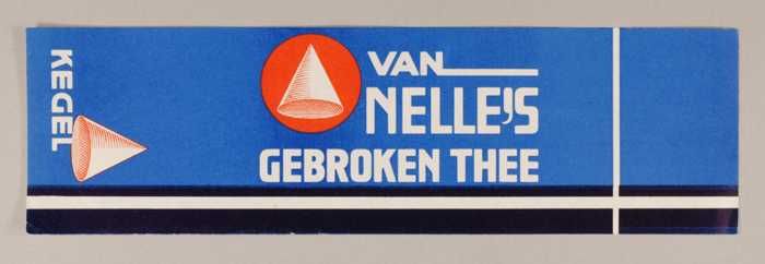 Blauw en rood, papieren label VAN NELLE'S KEGEL THEE...