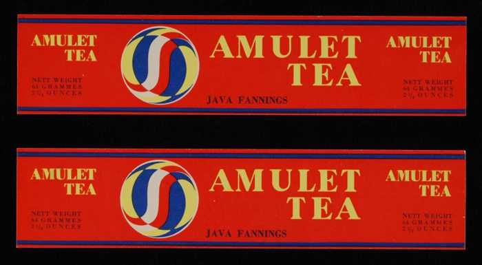 Twee rode, papieren labels VAN NELLE AMULET THEE, 10...