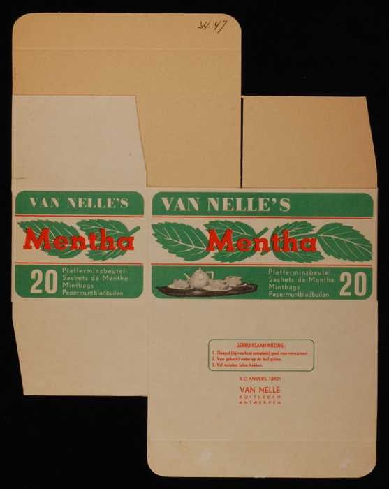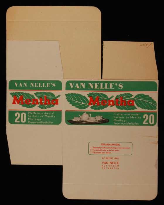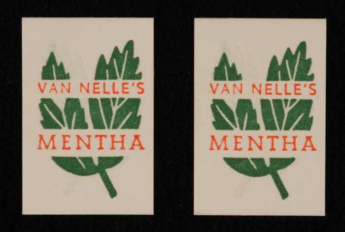 Twee witte, kartonnen labels VAN NELLE'S MENTHA THEE...