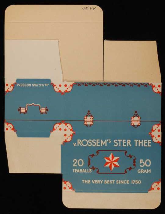 Ongevouwen, blauwe, kartonnen doos VAN ROSSEM'S STER...