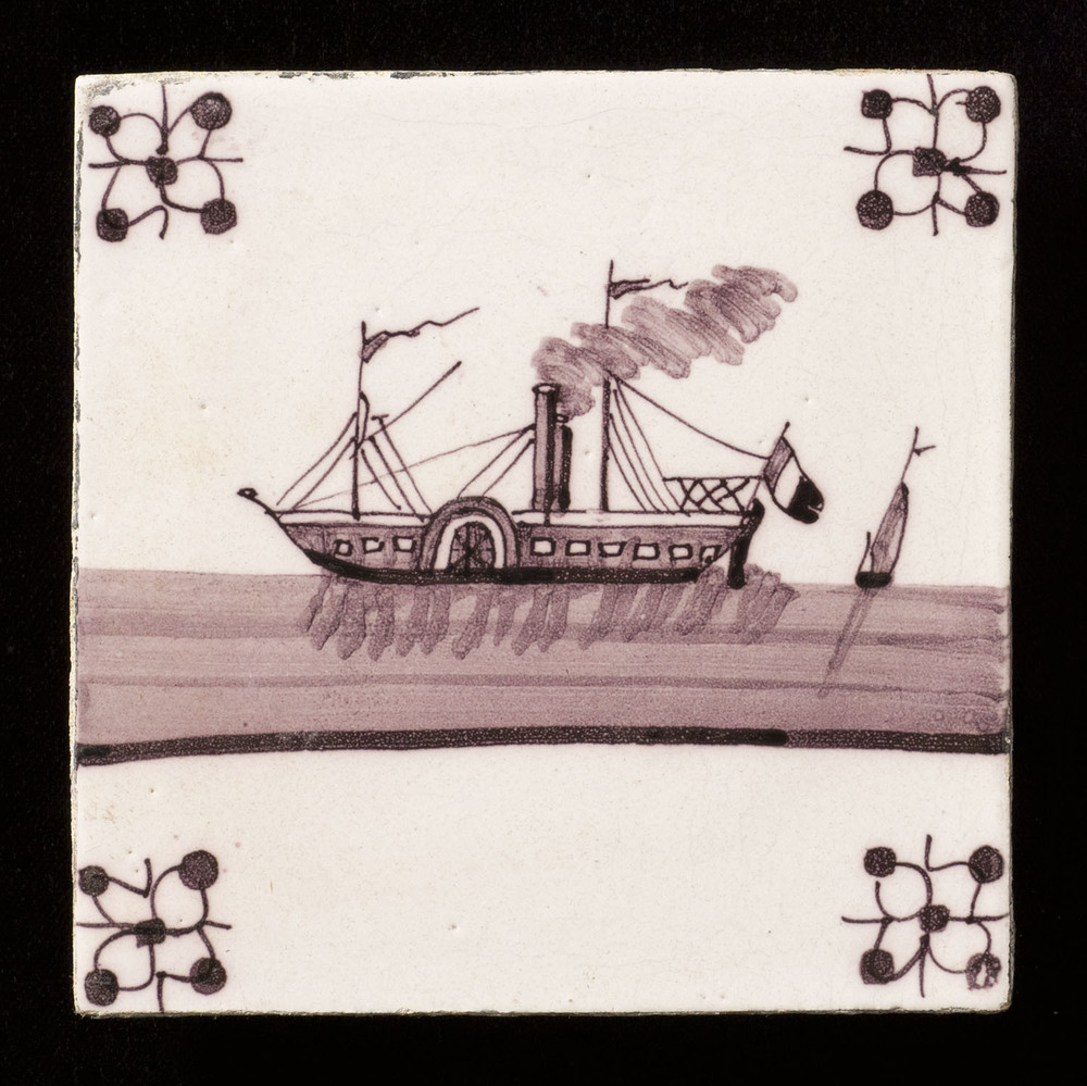 Tegel in tinglazuur, voorstellende scheepvaarttafere...