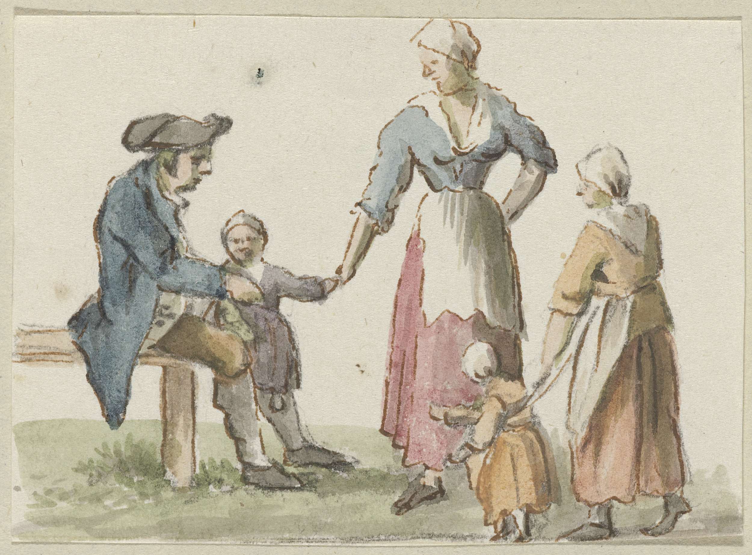 Zittende man en staande vrouw met drie kinderen