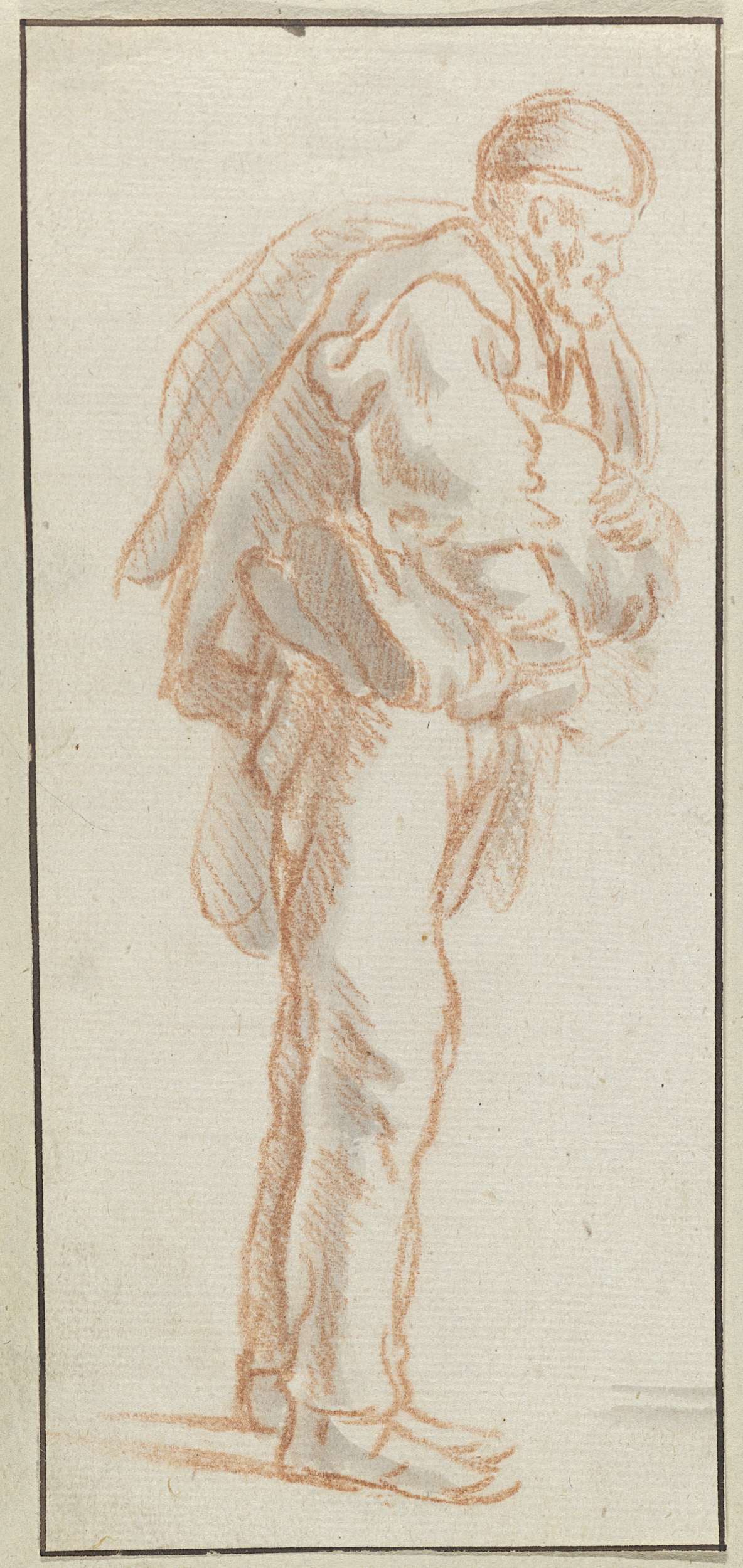 Staande man met spullen over zijn schouder en onder ...