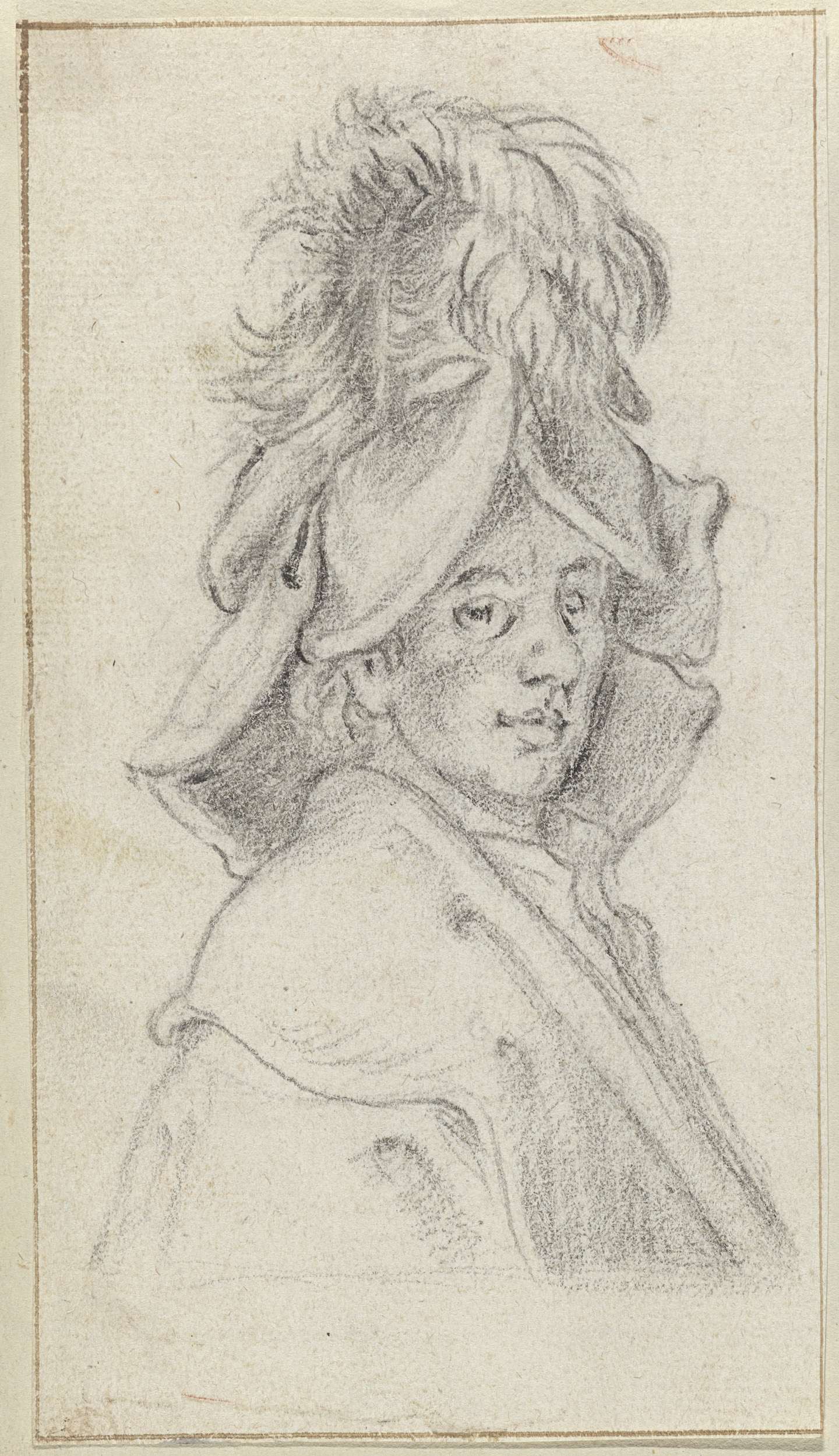 Borststuk van een man met hoofddeksel met veren