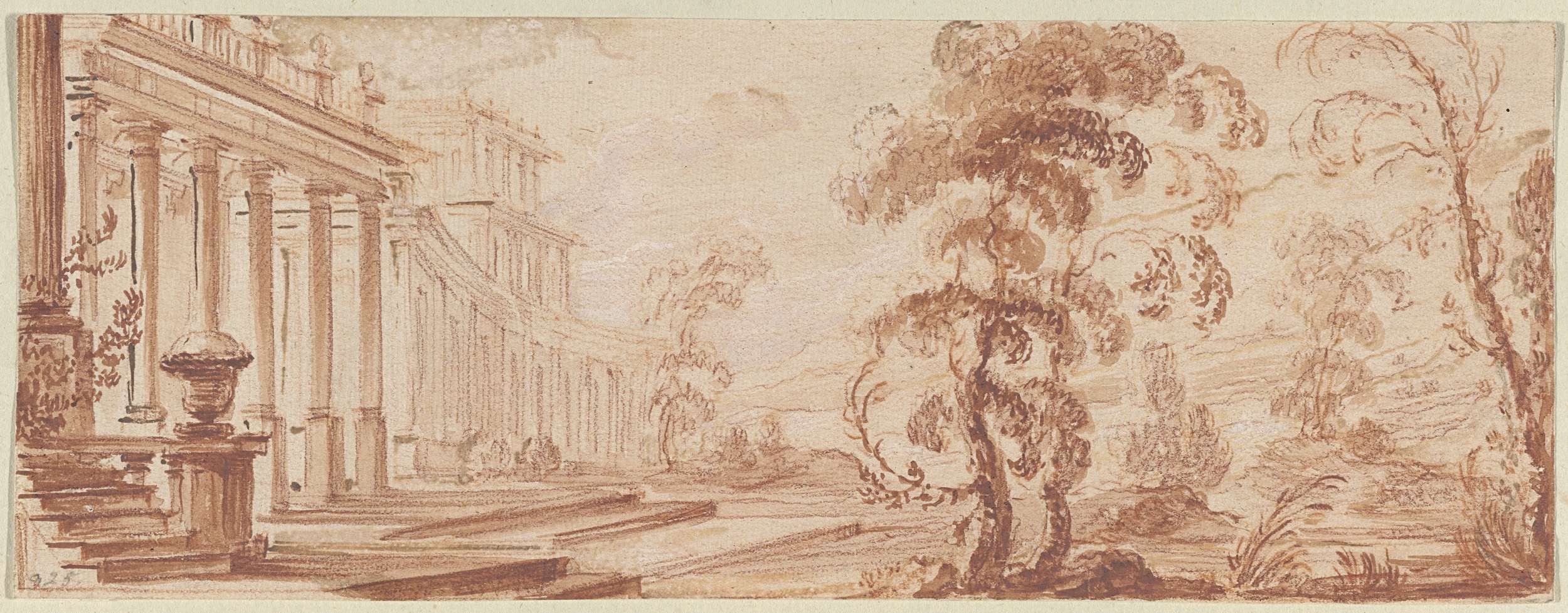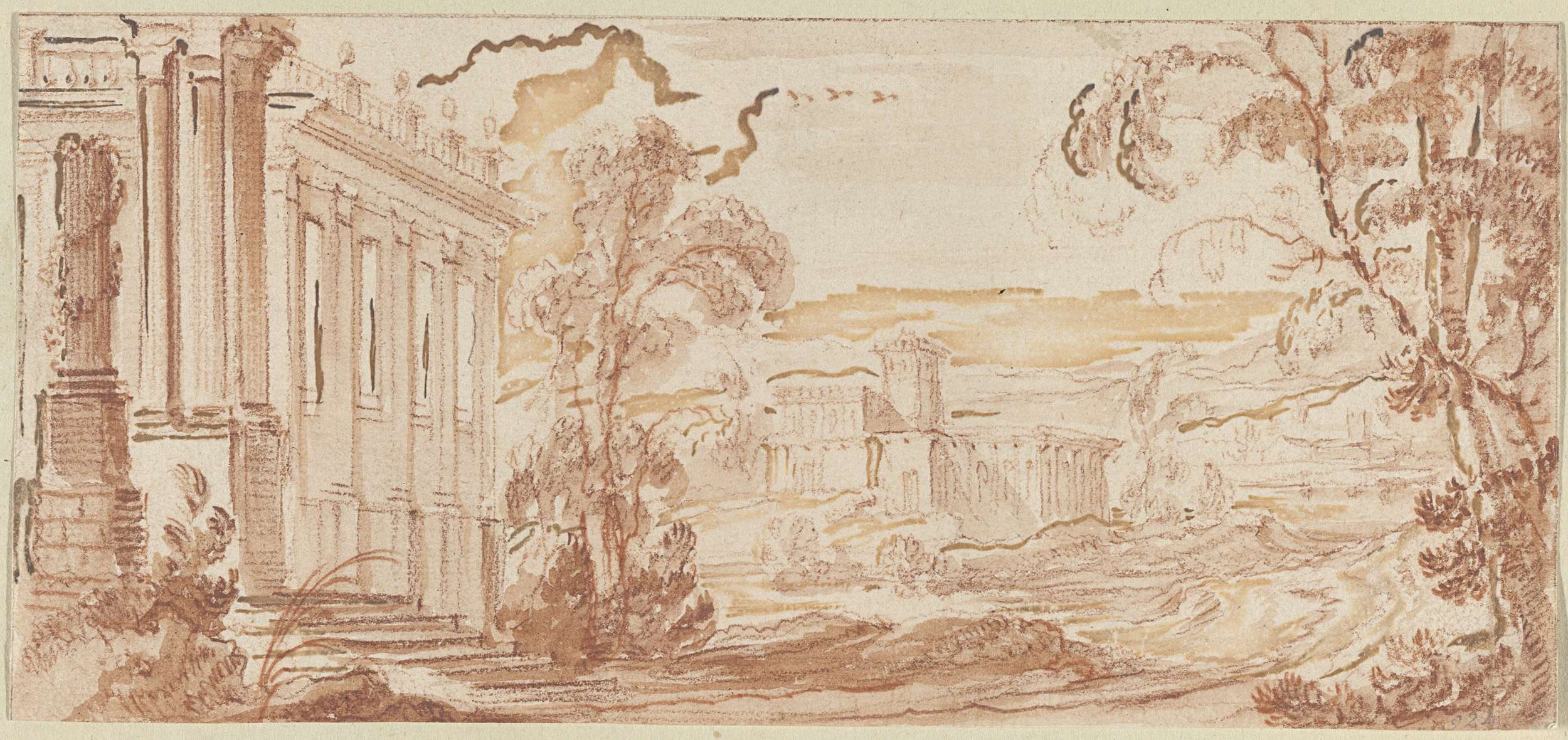Landschap met paleis met concave gevel