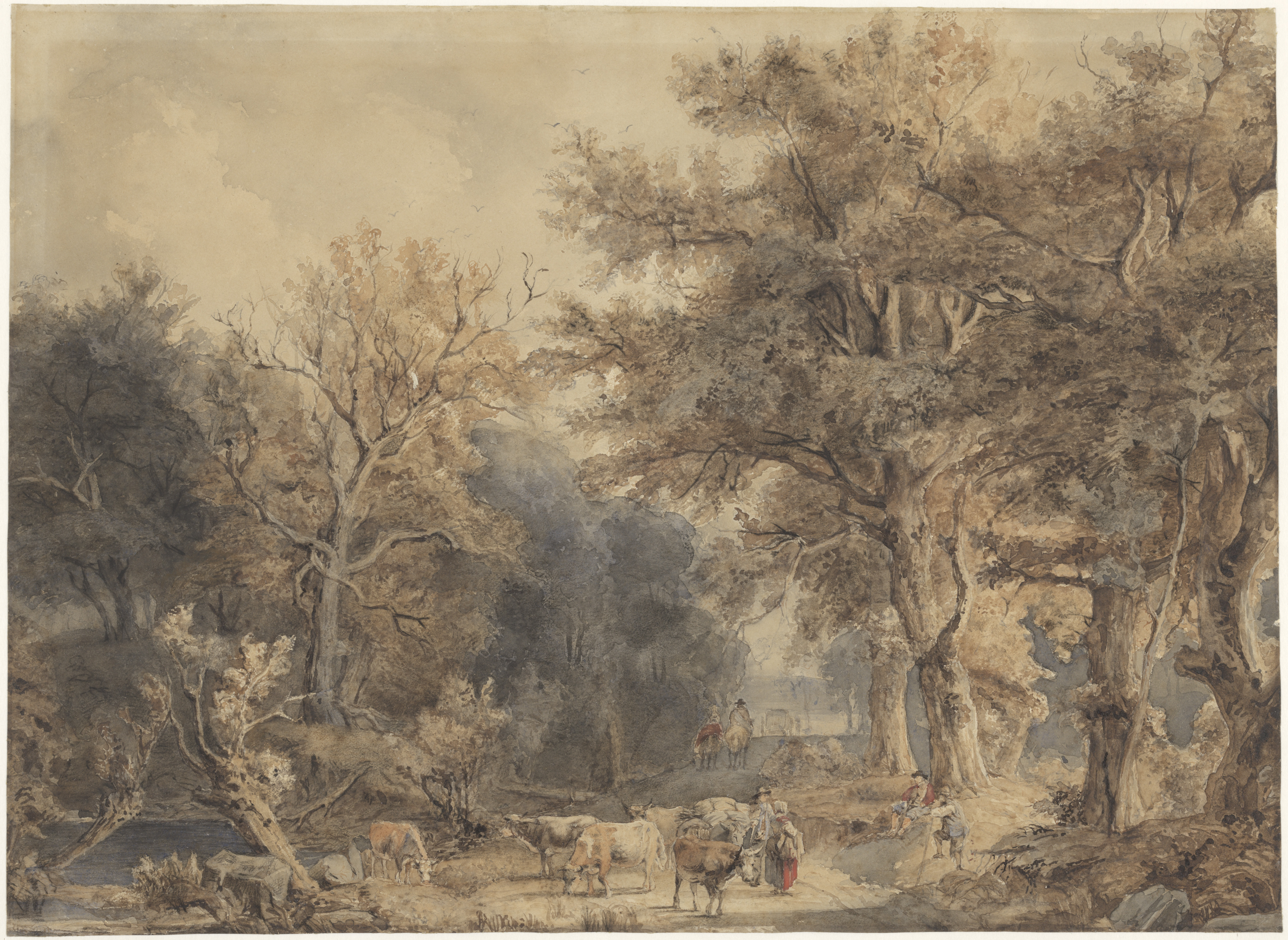Boslandschap met figuren en vee