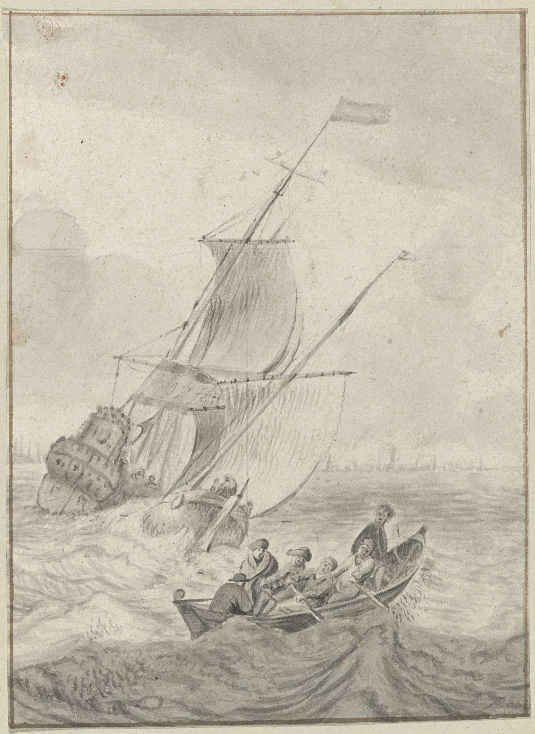 Twee zeilschepen en een roeiboot in stormachtig weer