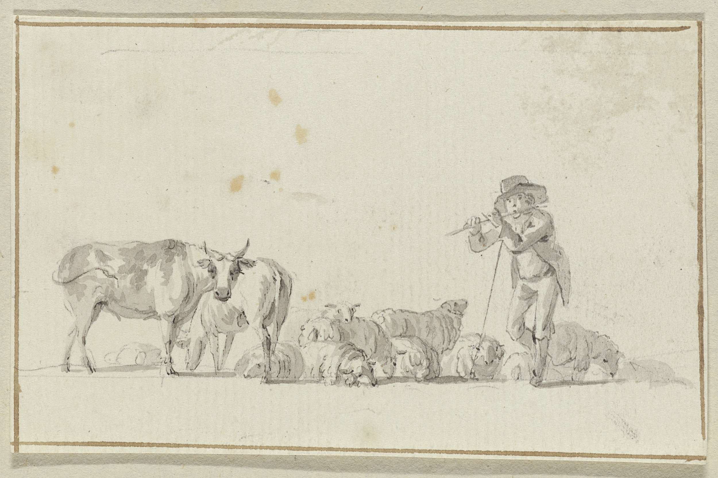 Fluitspelende herder staand bij zijn kudde