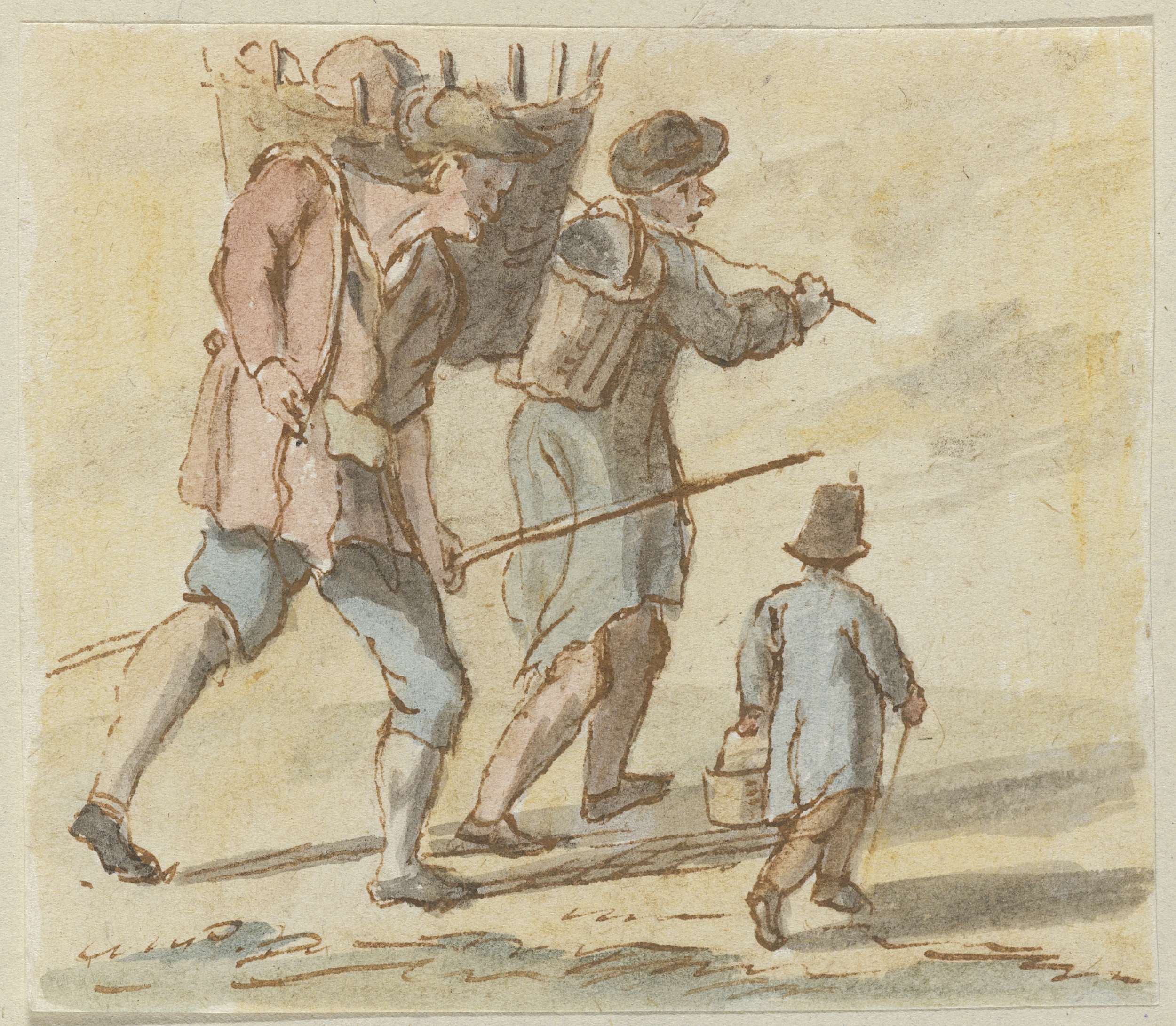 Twee lopende mannen met een mand op de rug en een ki...