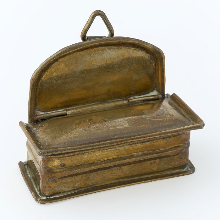 Gedreven ovale puddingvorm met afbeelding St. Eligius