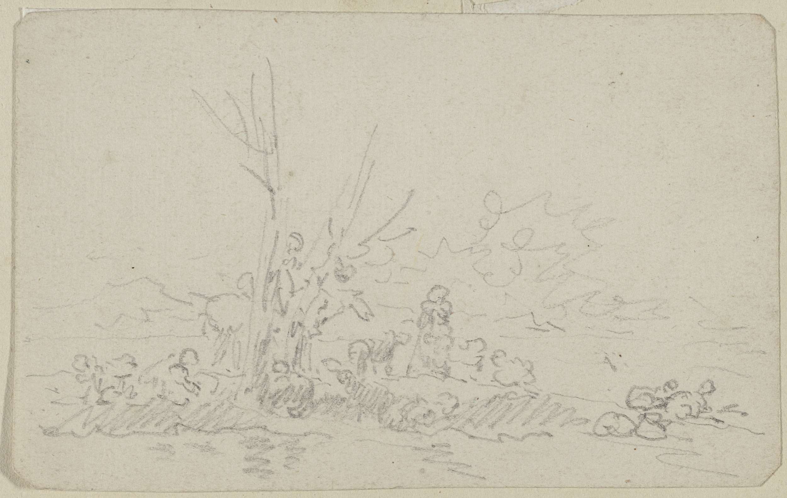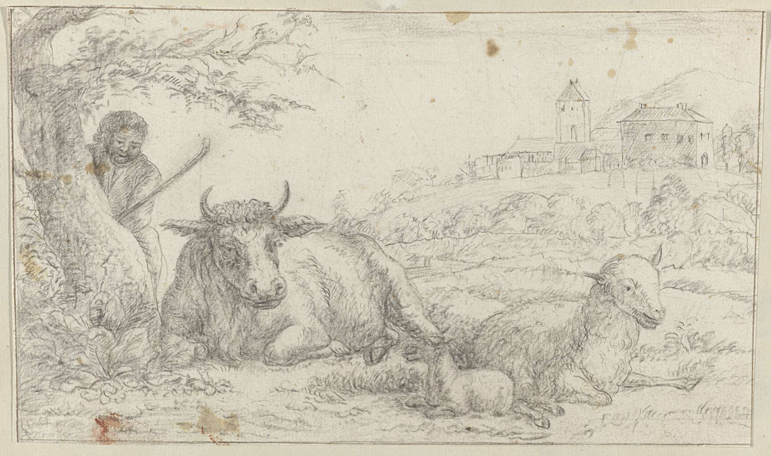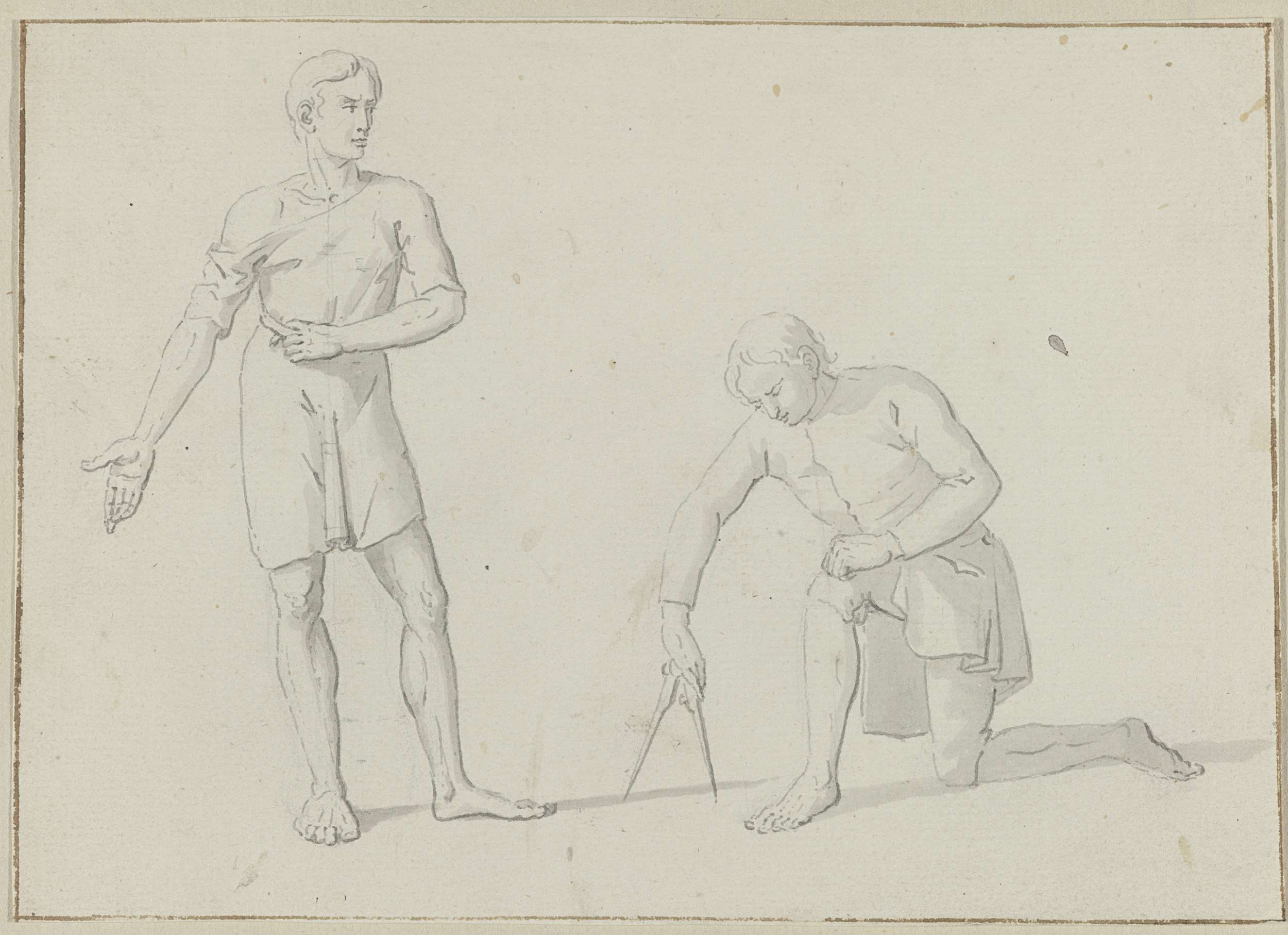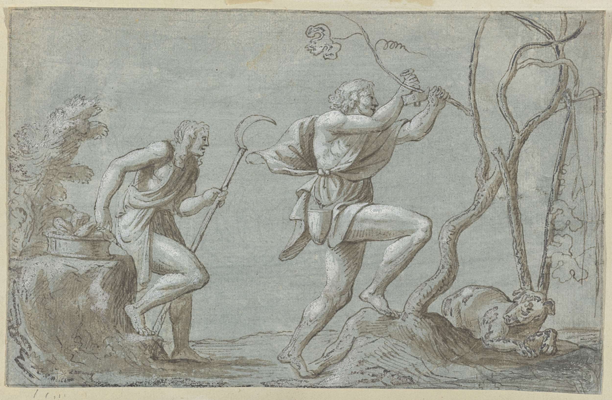 Twee centaurs, een bok, een boom en twee mensfiguren