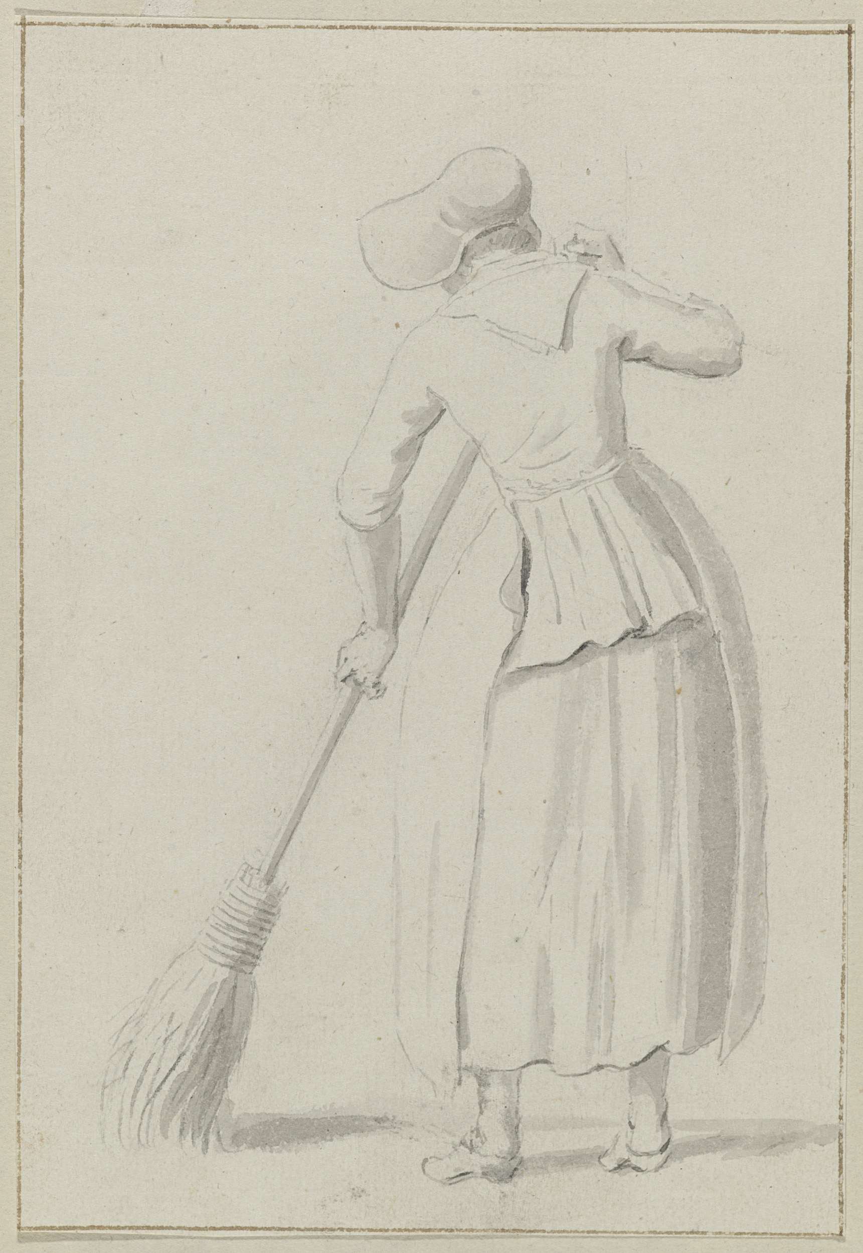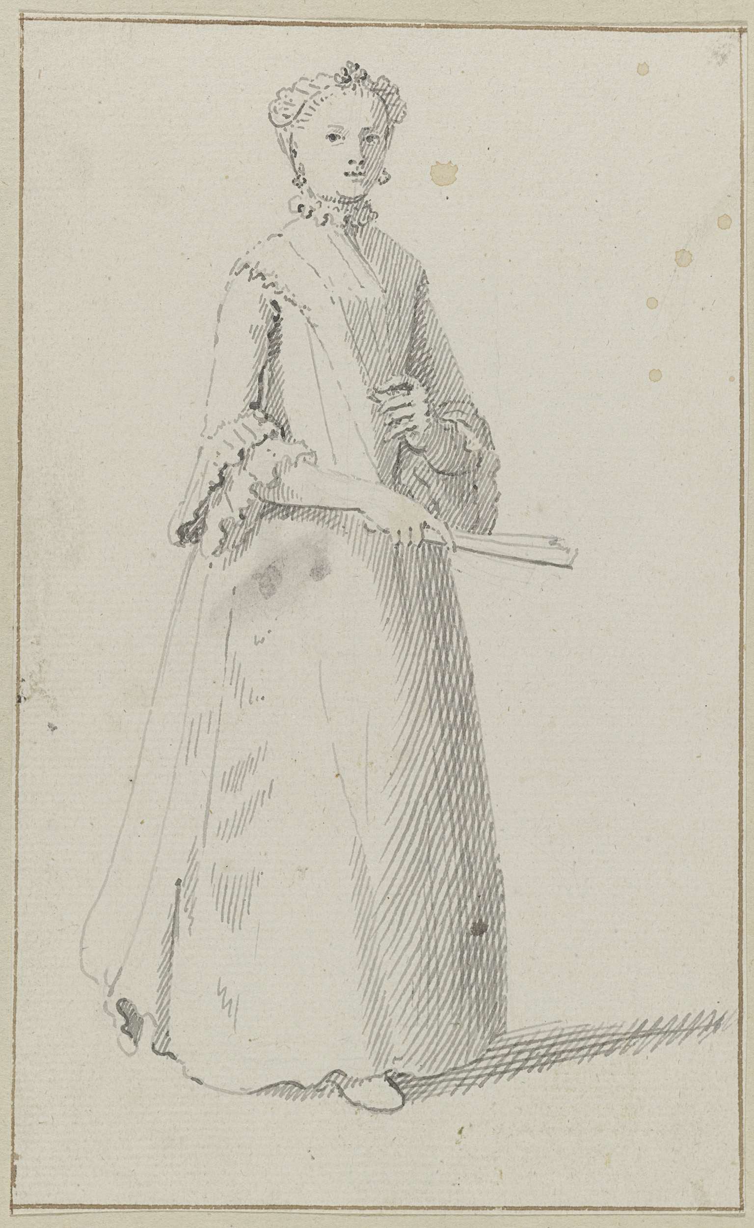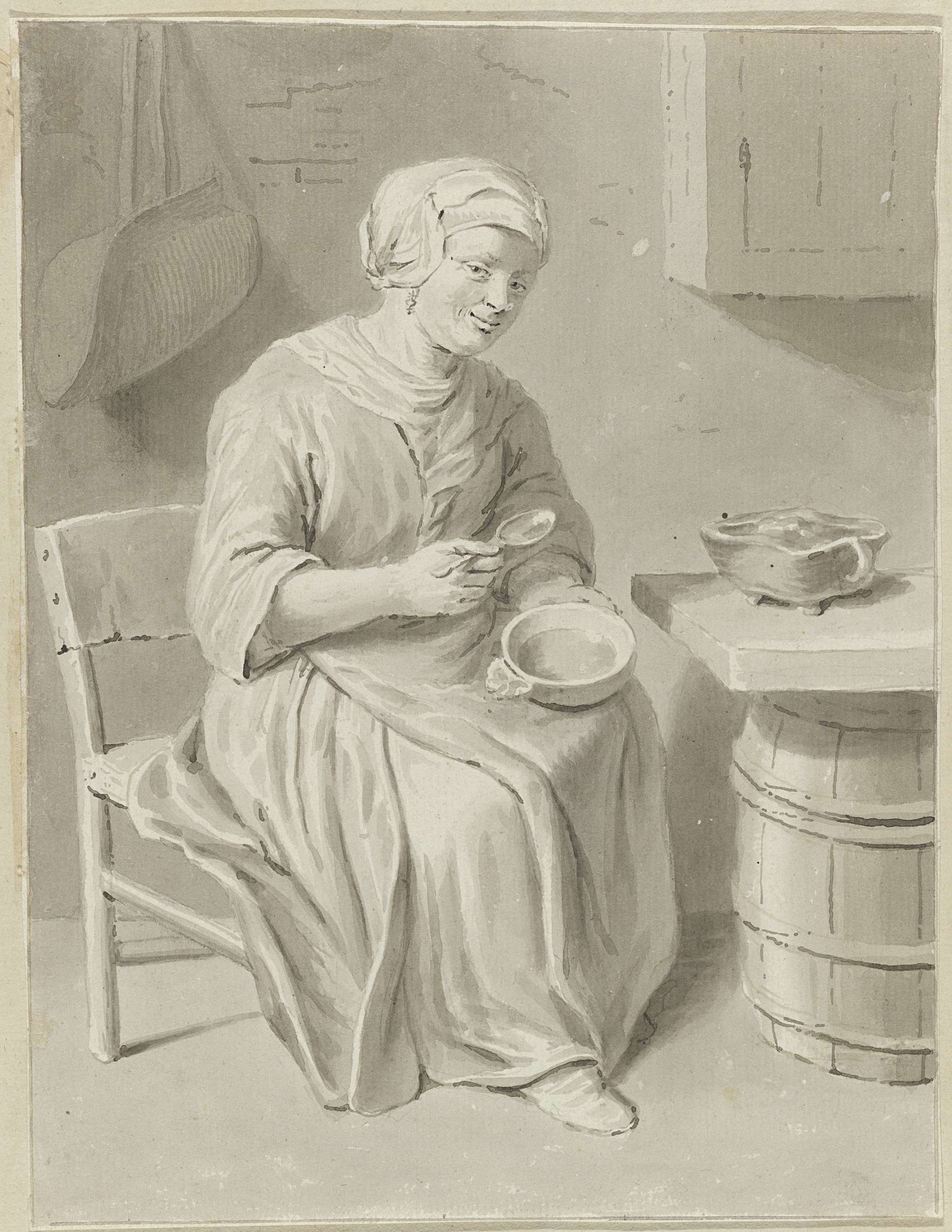 Op stoel zittende vrouw en vrouw met waaier op de ru...