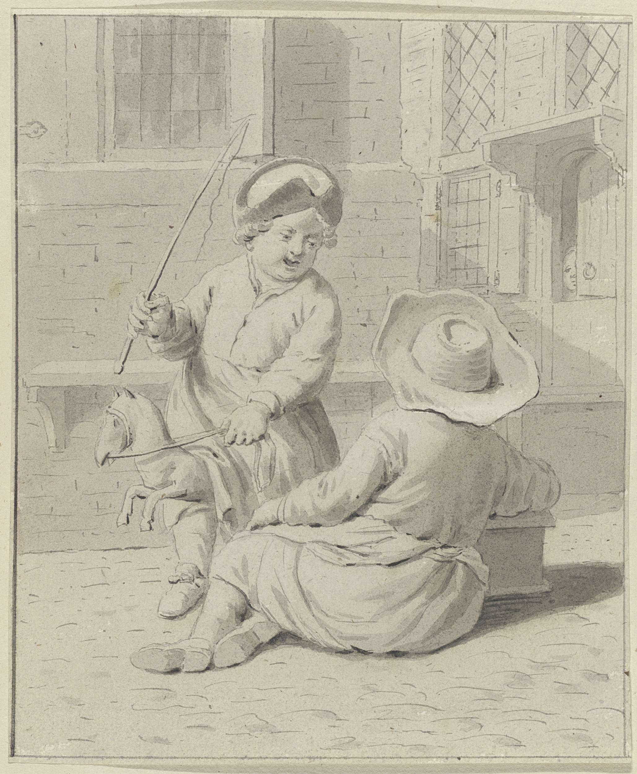 Twee kinderen op straat met een speelgoedpaard, een ...
