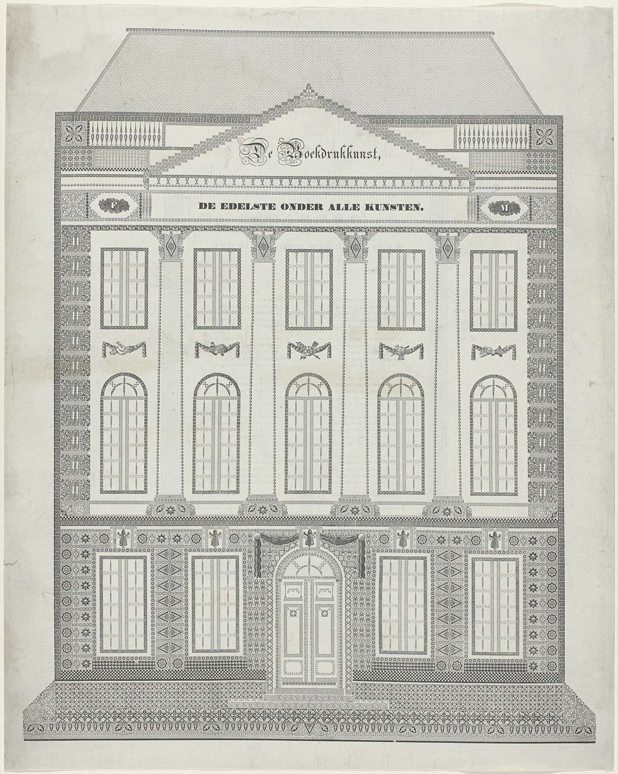 Koppermaandagprent met de versierde gevel van een hu...