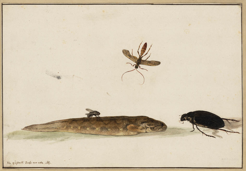 Blad met een puitaal, een vlieg, een wesp en een kever