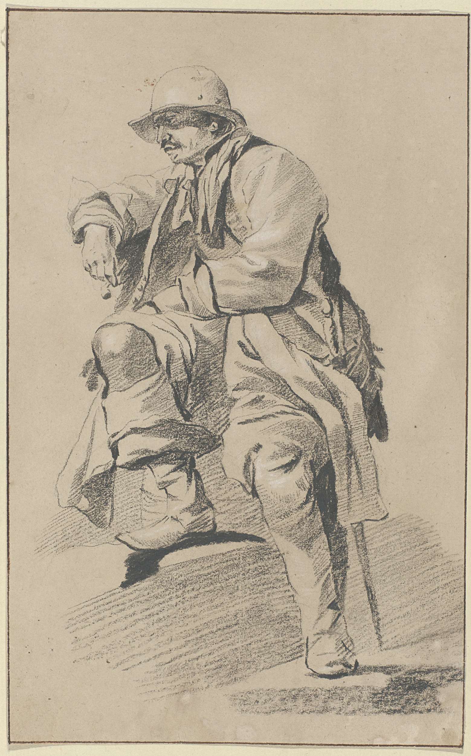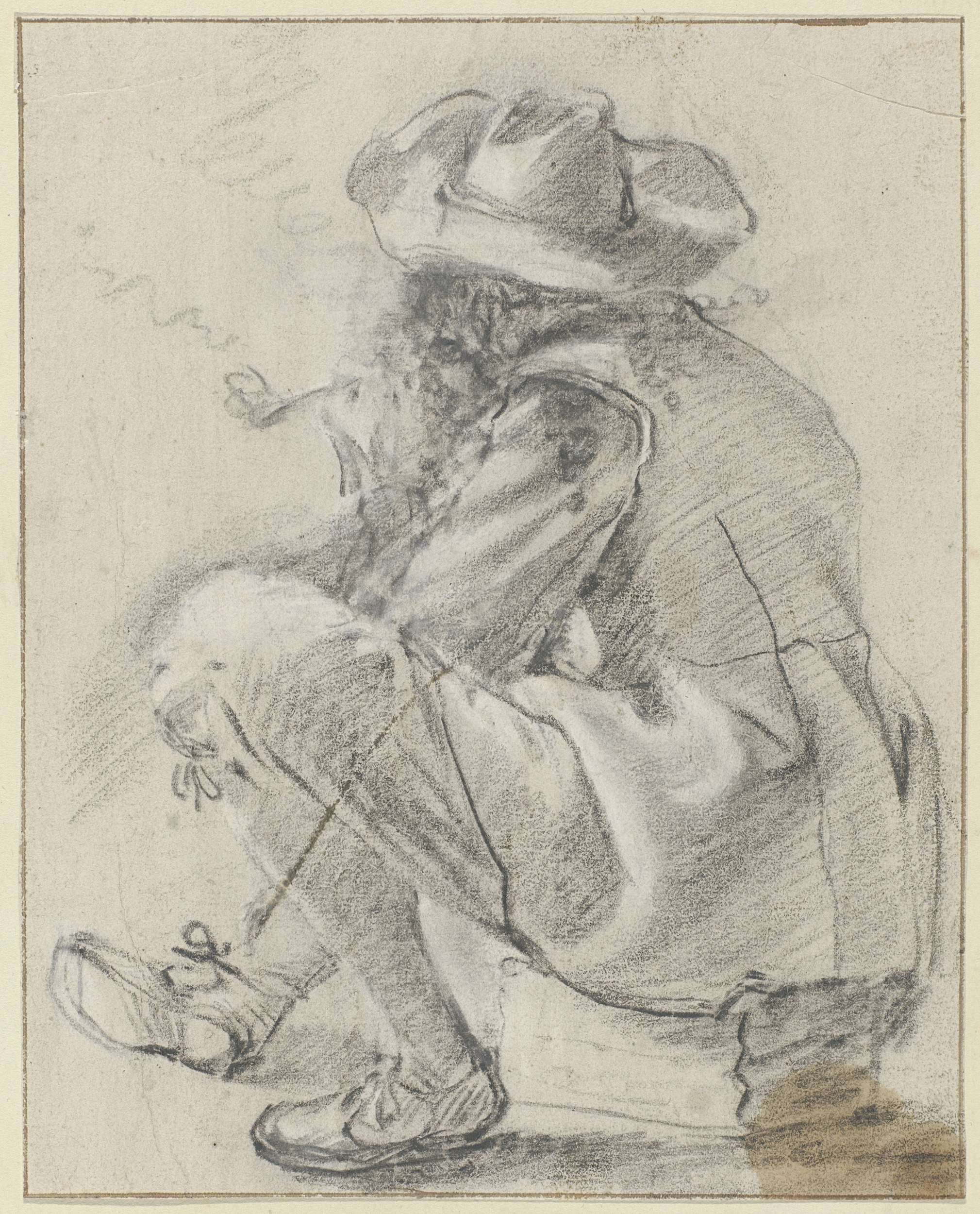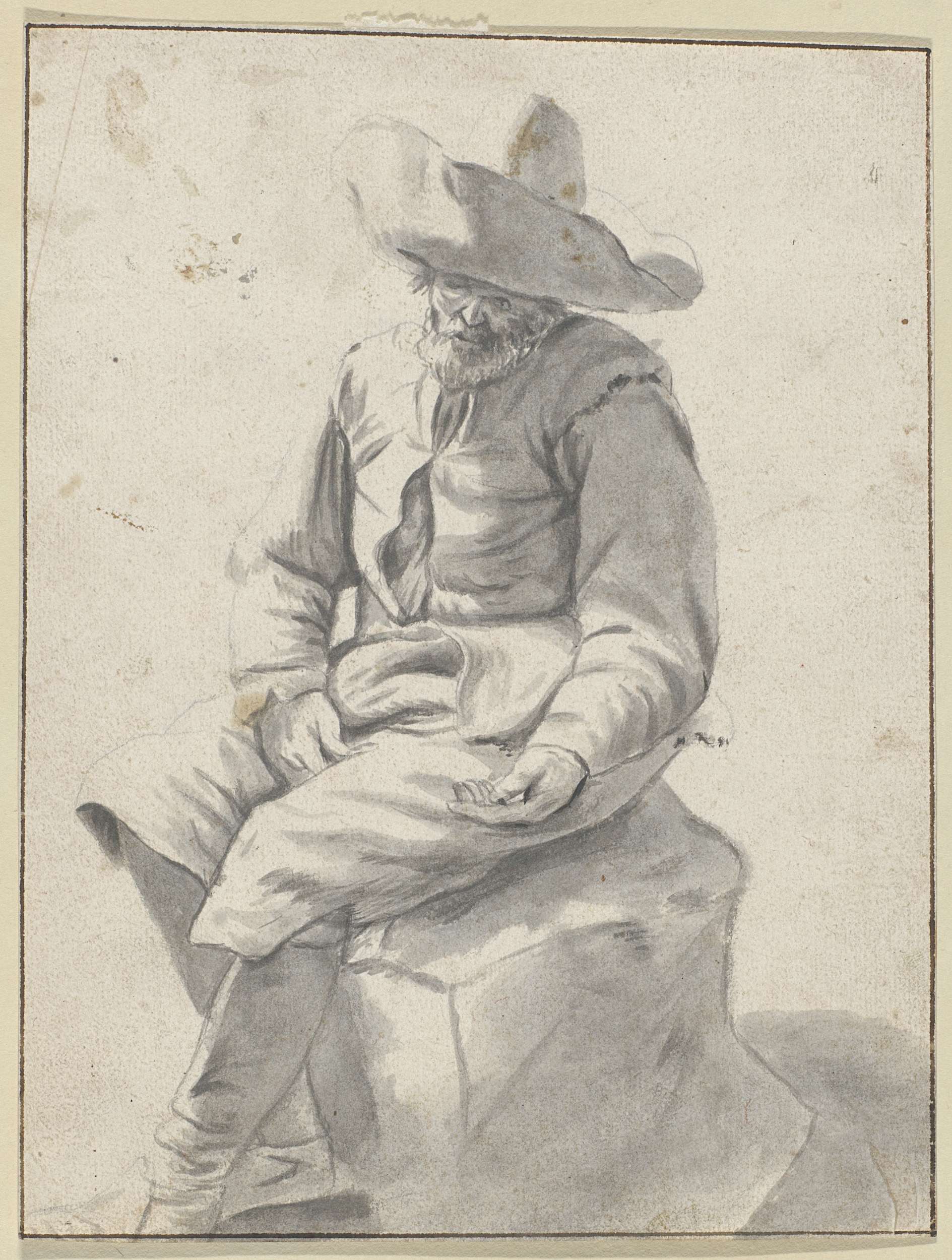 Zittende man op de rug gezien, zijn hoed in zijn han...