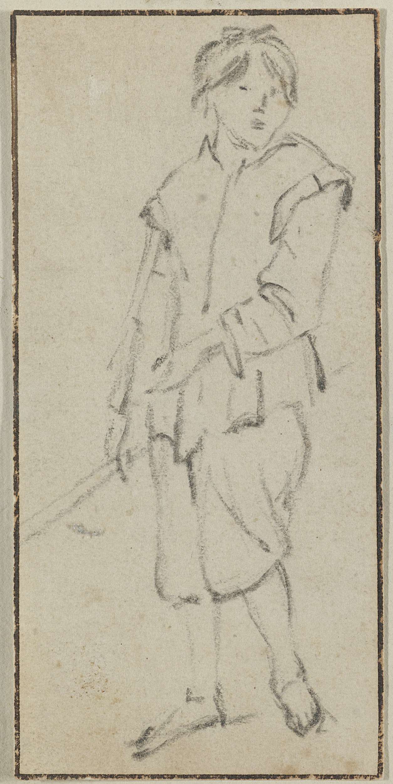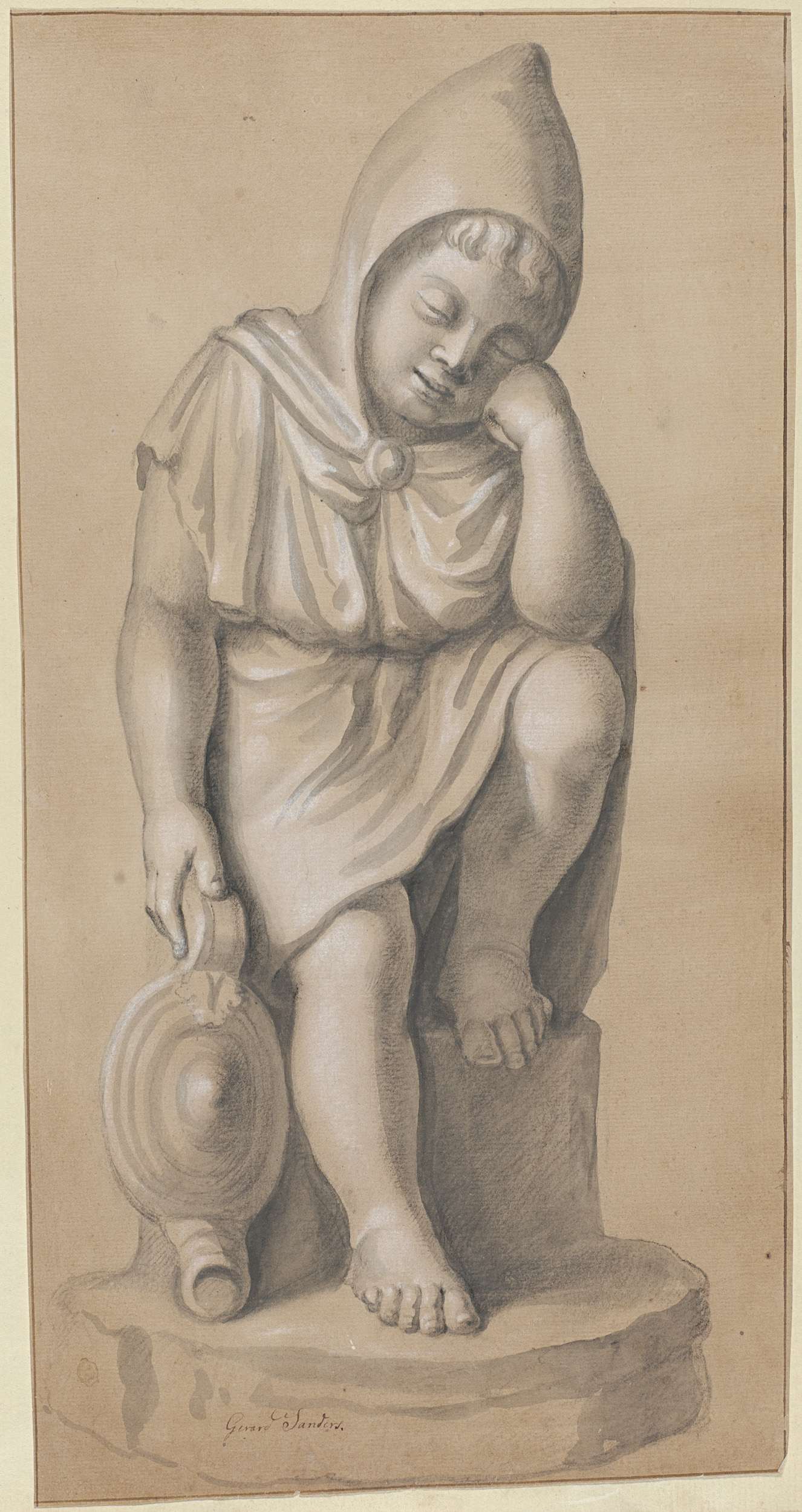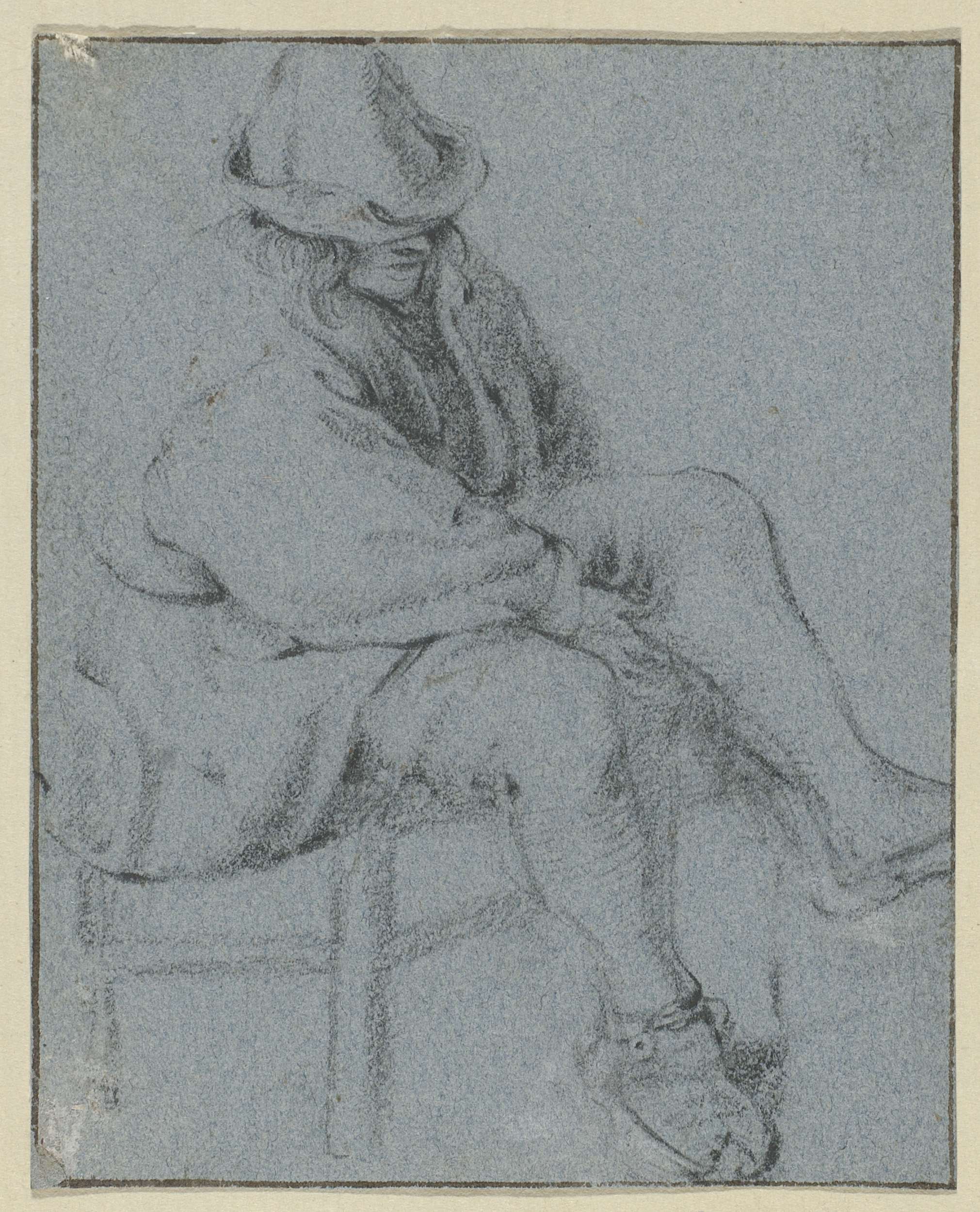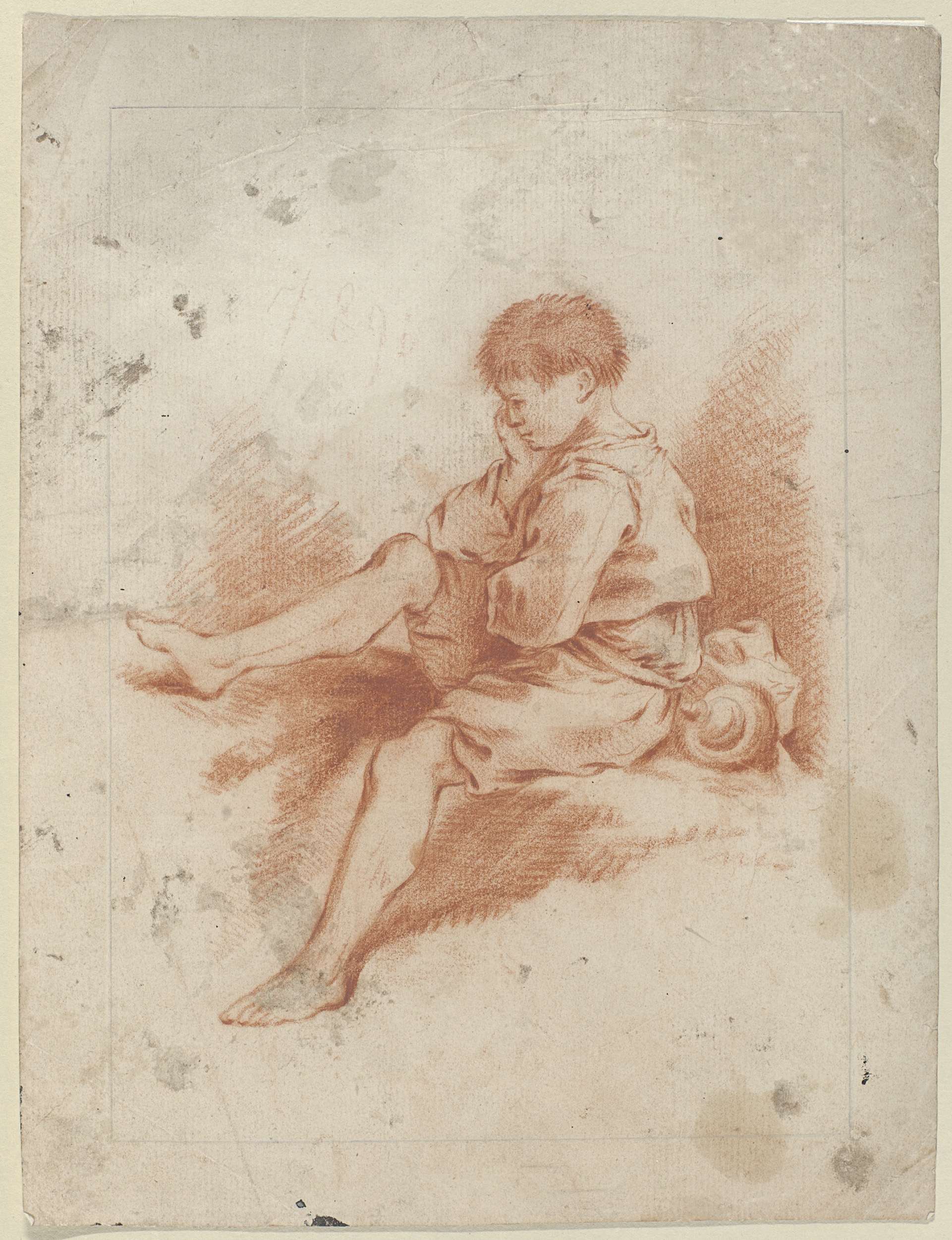 Zittende jongen met opgetrokken been, zijn hoofd op ...