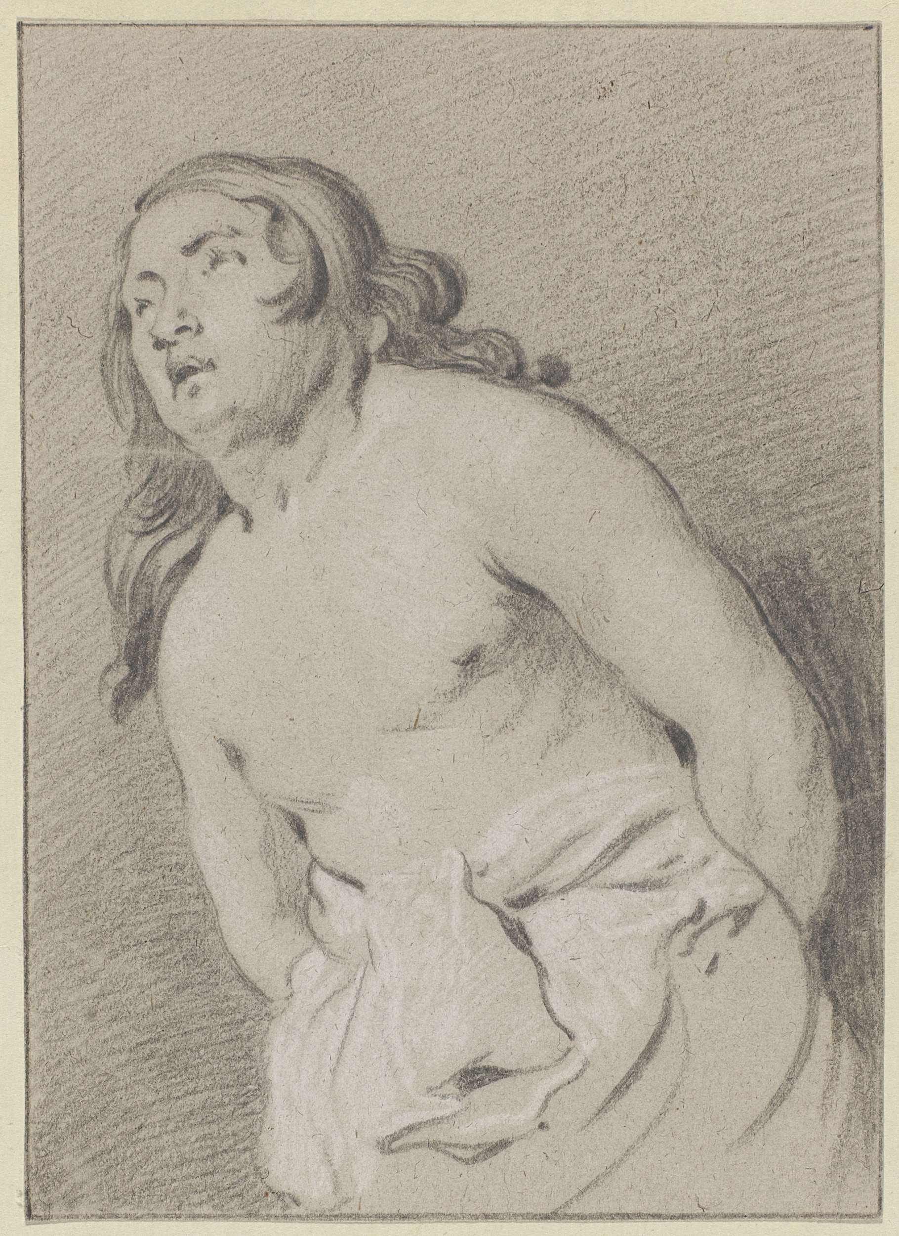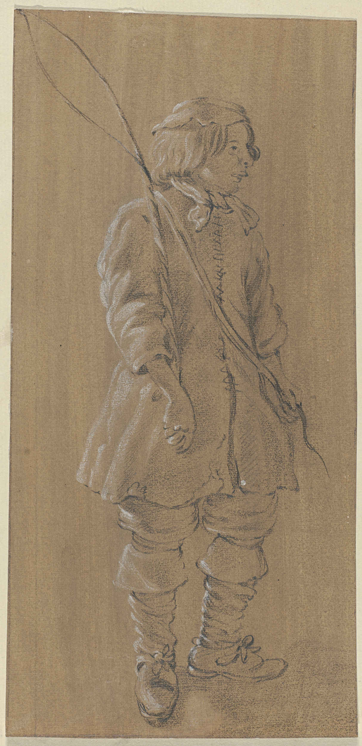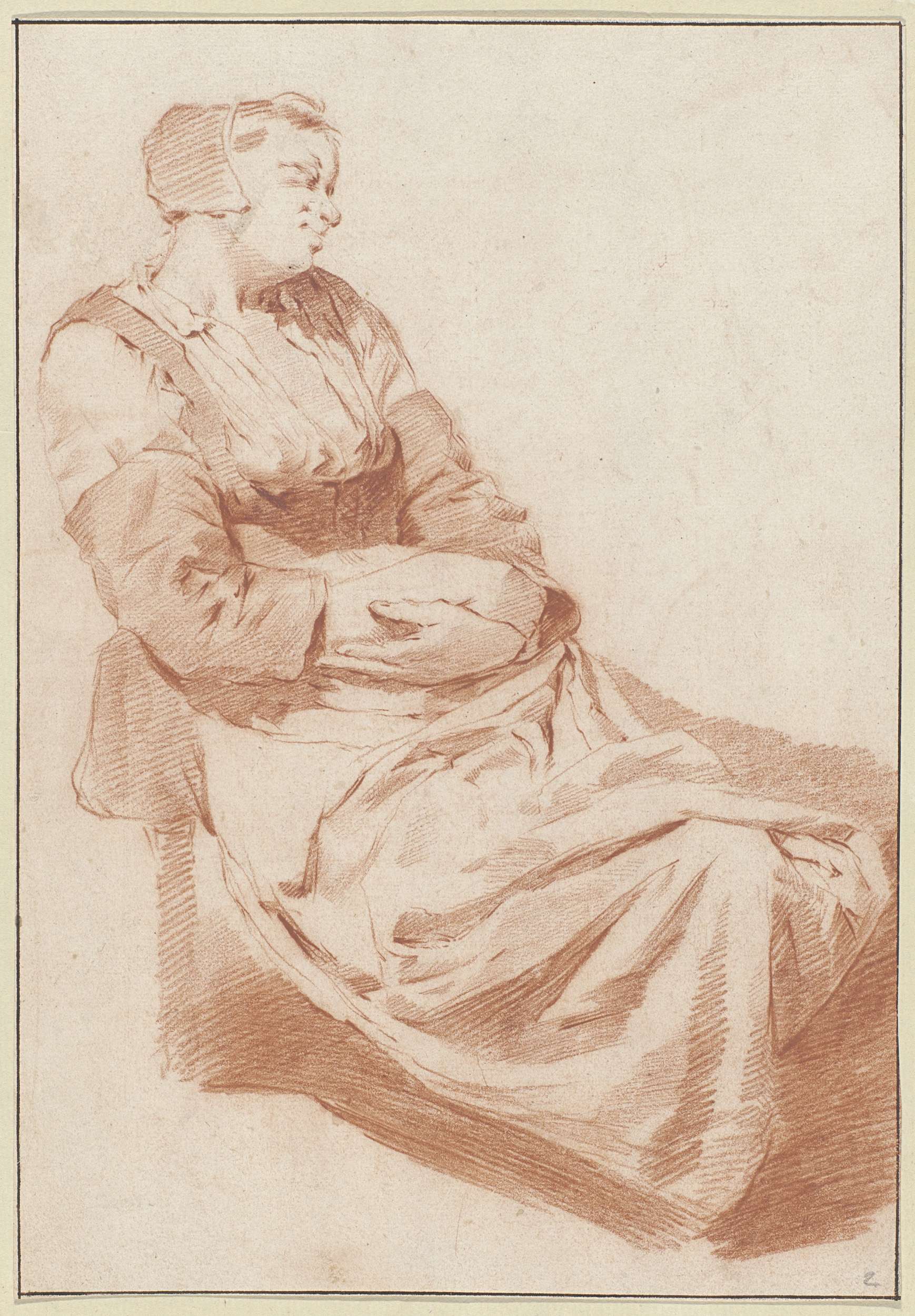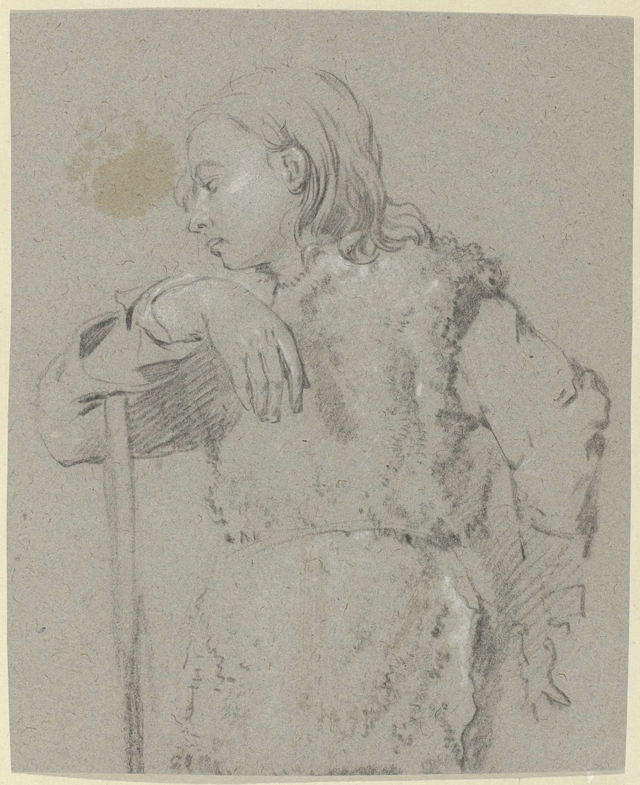 Zittende jongen met opgetrokken been, zijn hoofd op ...