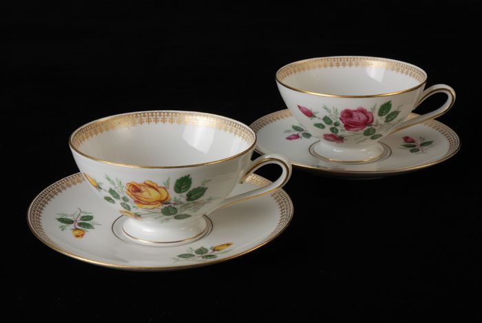 Theekop (A) en schotel (B) met rood bloemmotief van ...
